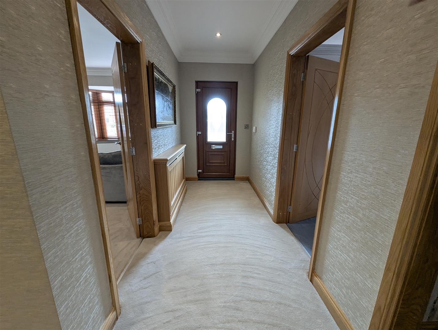 Upvc double glazed bow window to front, coving and spotlights to ceiling. Feature media wall, inset fire with living flame.