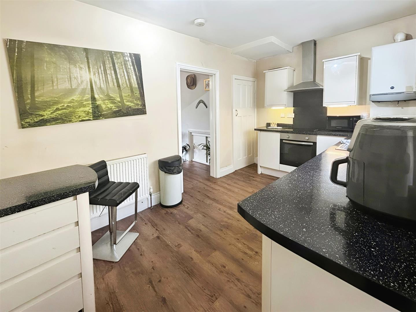 Having high gloss fitted wall and base unit having laminate work surfaces over, integrated electric oven and hob having extractor over, stainless steel sink unit with mixer tap, plumbing for concealed washing machine, breakfast bar, wall mounted gas boiler, central heating radiator and uPVC double glazed window to rear.
