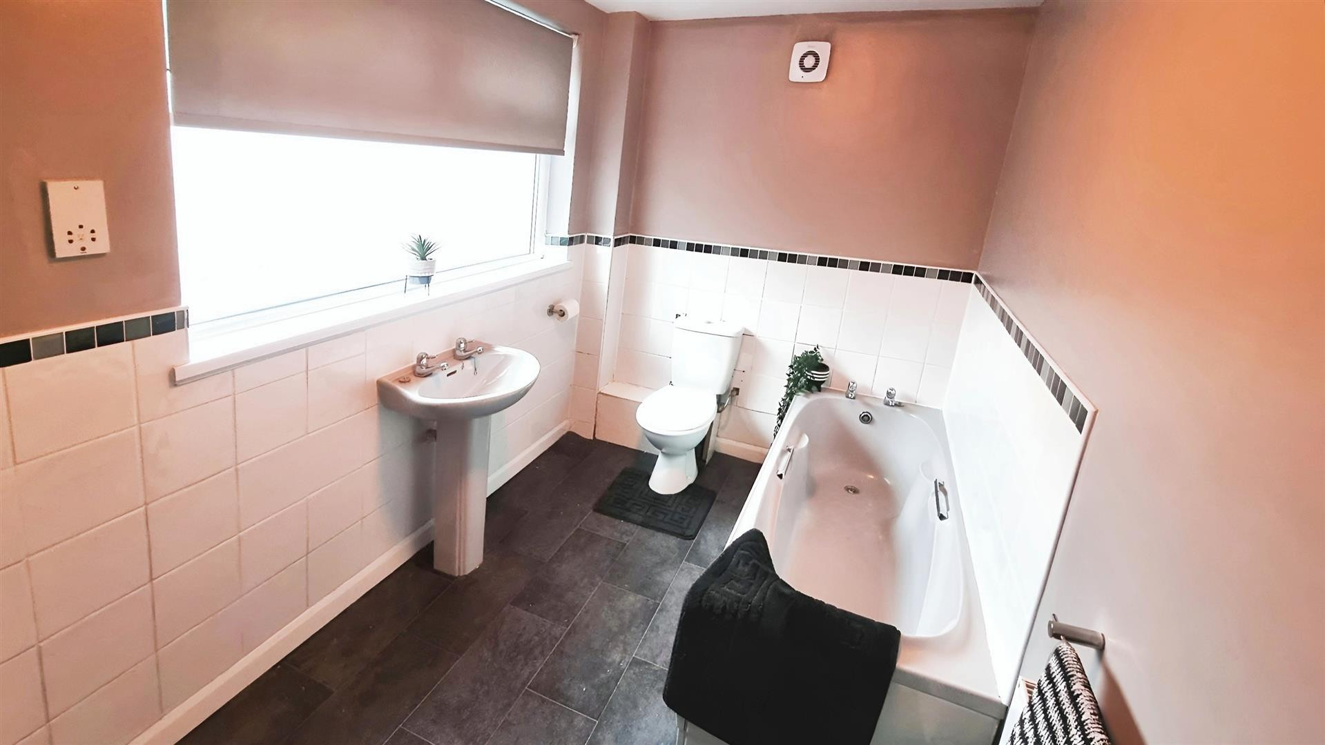 Fitted with a suite comprising of panelled bath, WC, wash hand basin , storage cupboard housing gas boiler and central heating radiator.