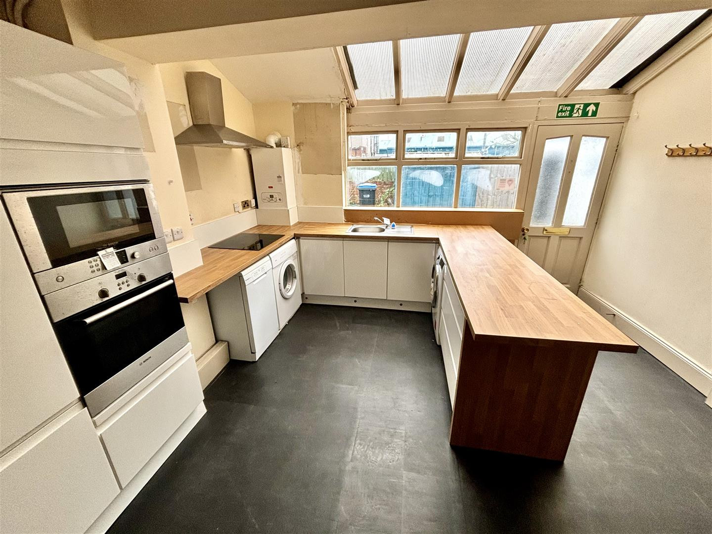 There is an external door and window to the front, spotlighting and two radiators.