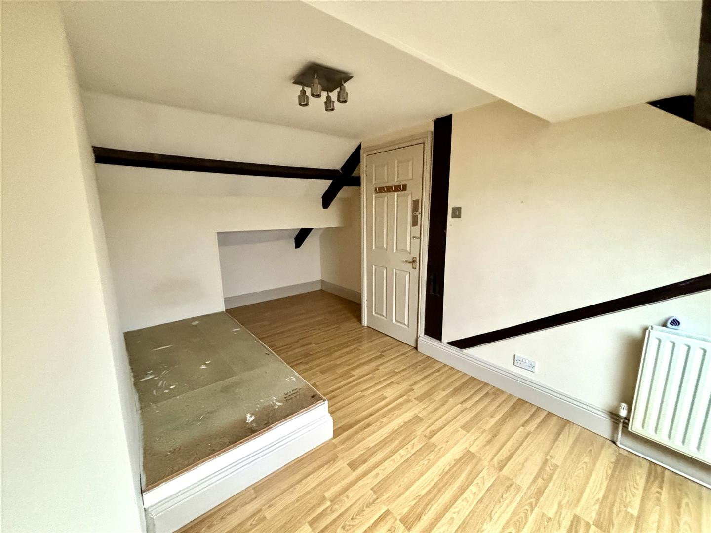 Large bedroom with a velux window, laminate flooring and radiator.