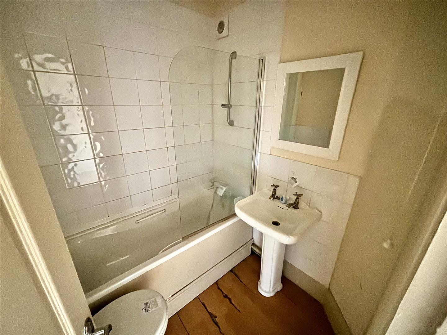 Fitted with a white suite comprising of a panelled bath with mixer shower over, pedestal hand wash basin and WC. Having tiled splashbacks and flooring and an extractor fan.