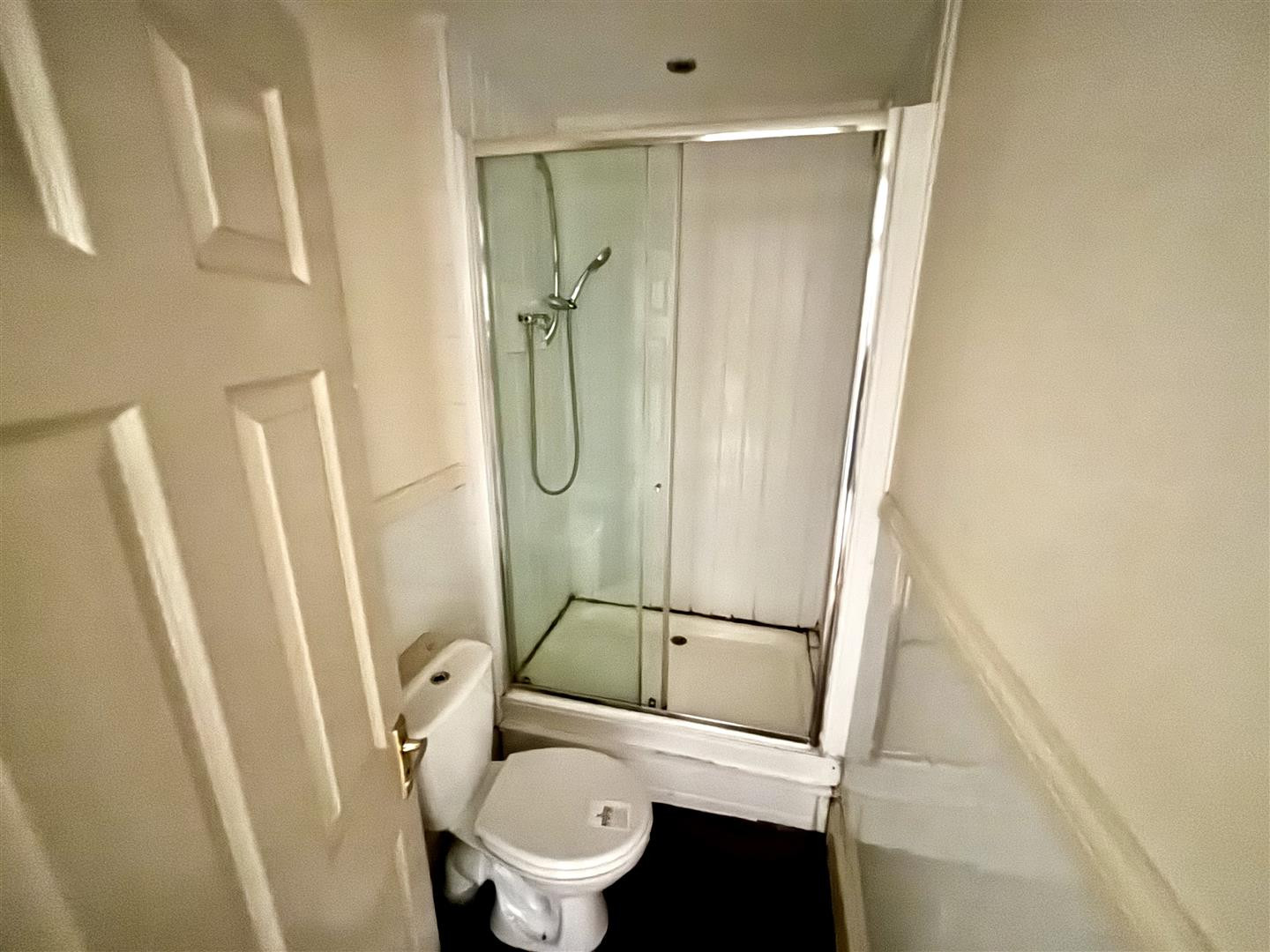 Having a cubicle with mains fed shower, pedestal hand wash basin and WC. Having laminate flooring, recessed spotlighting, extractor fan and radiator.