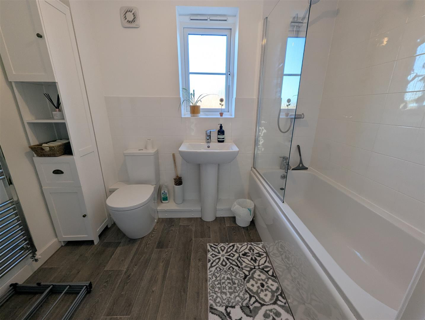 Upvc double glazed obscure window to rear, fitted with panelled bath with overhead shower and screen. Low level w.c, wash hand basin and radiator. Laminate floor.