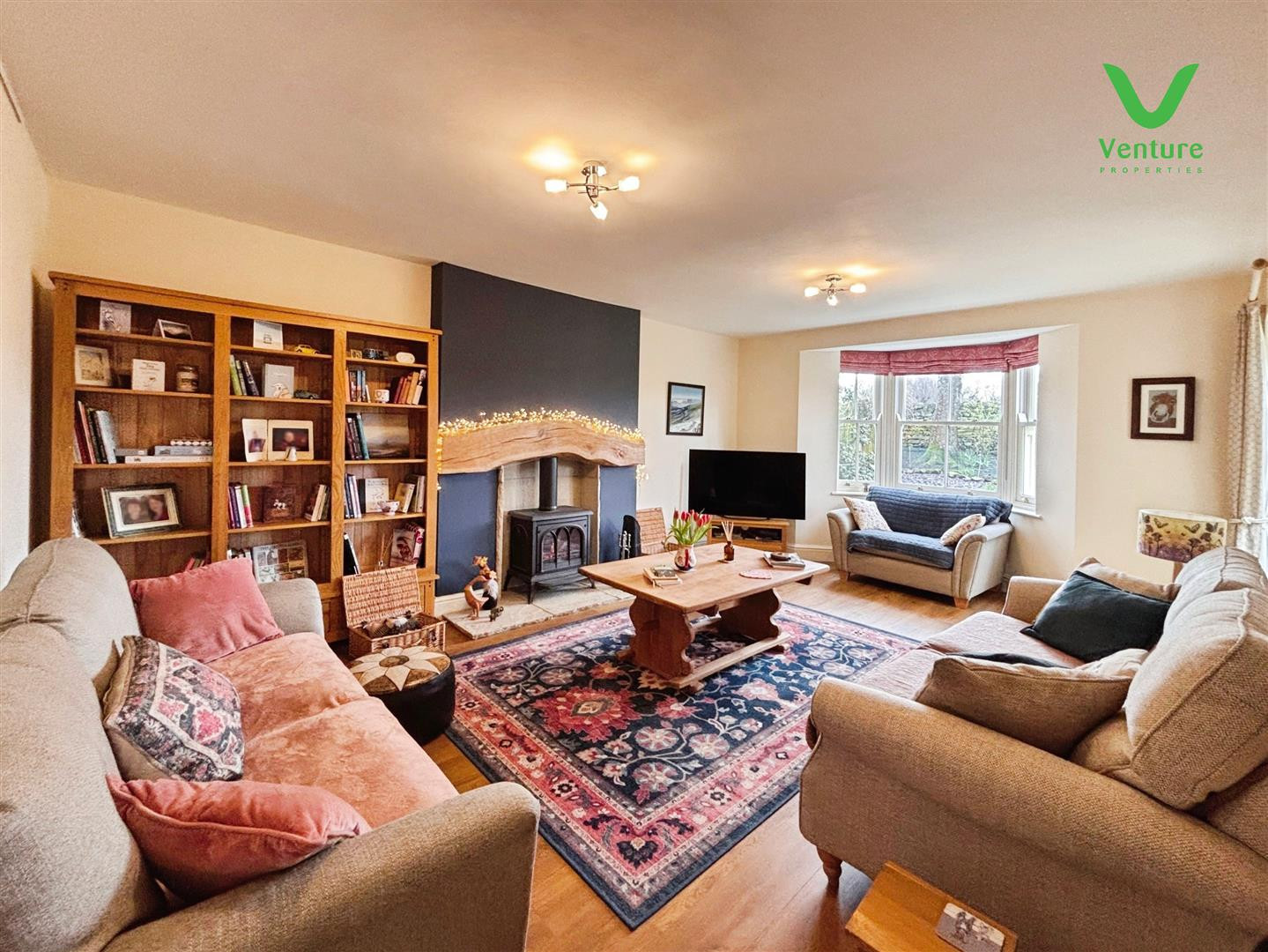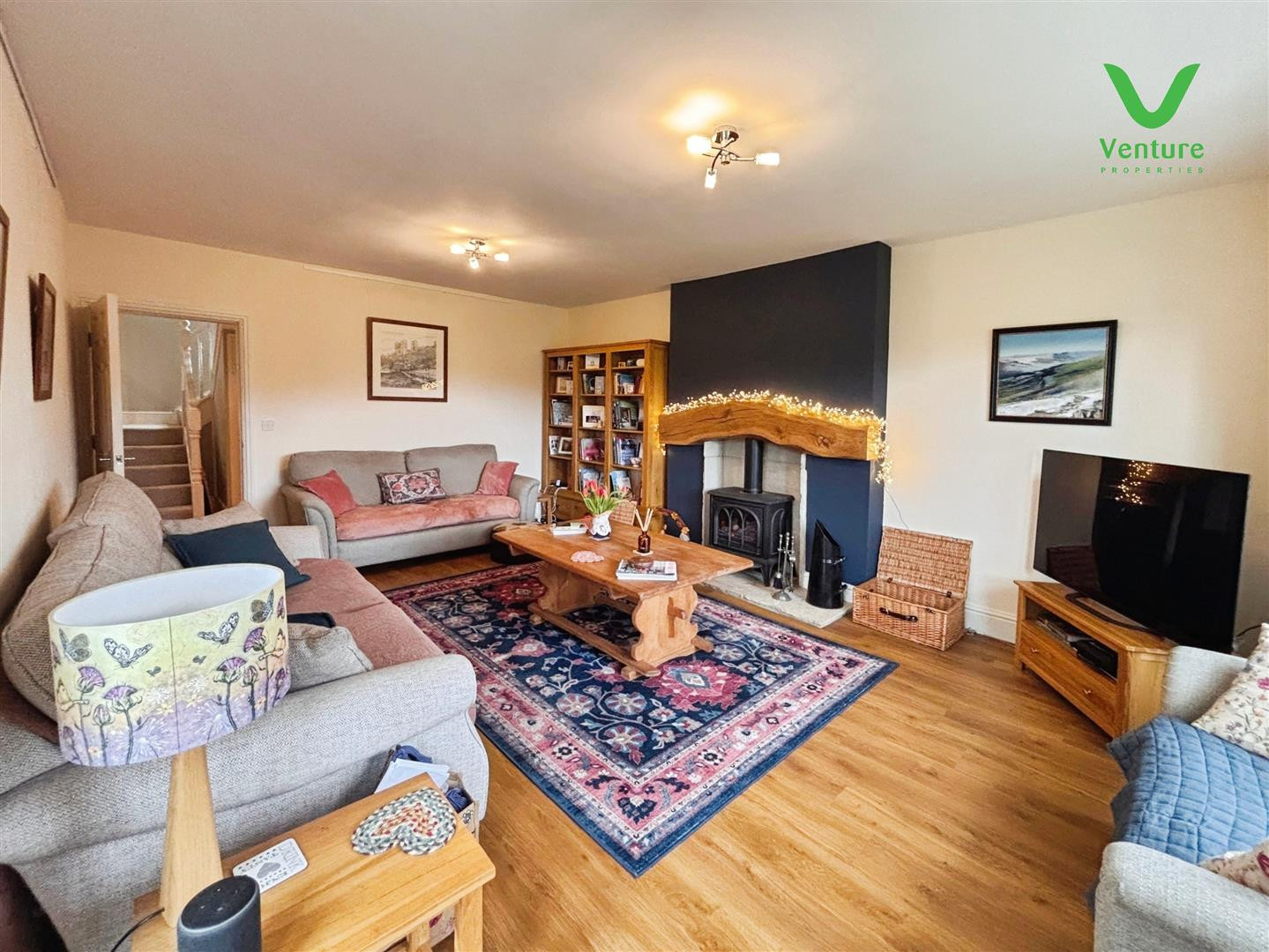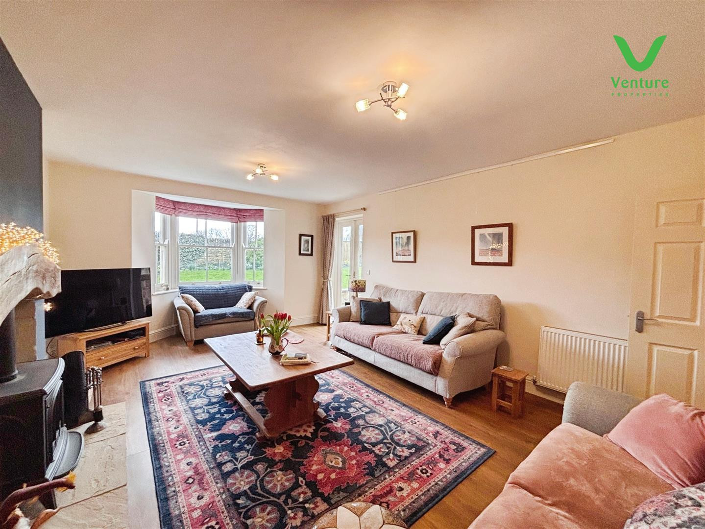 Having feature inglenook fireplace with floating oak mantle housing log effect gas stove , Karndean flooring ,sash windows and double glazed French doors opening out into the garden.