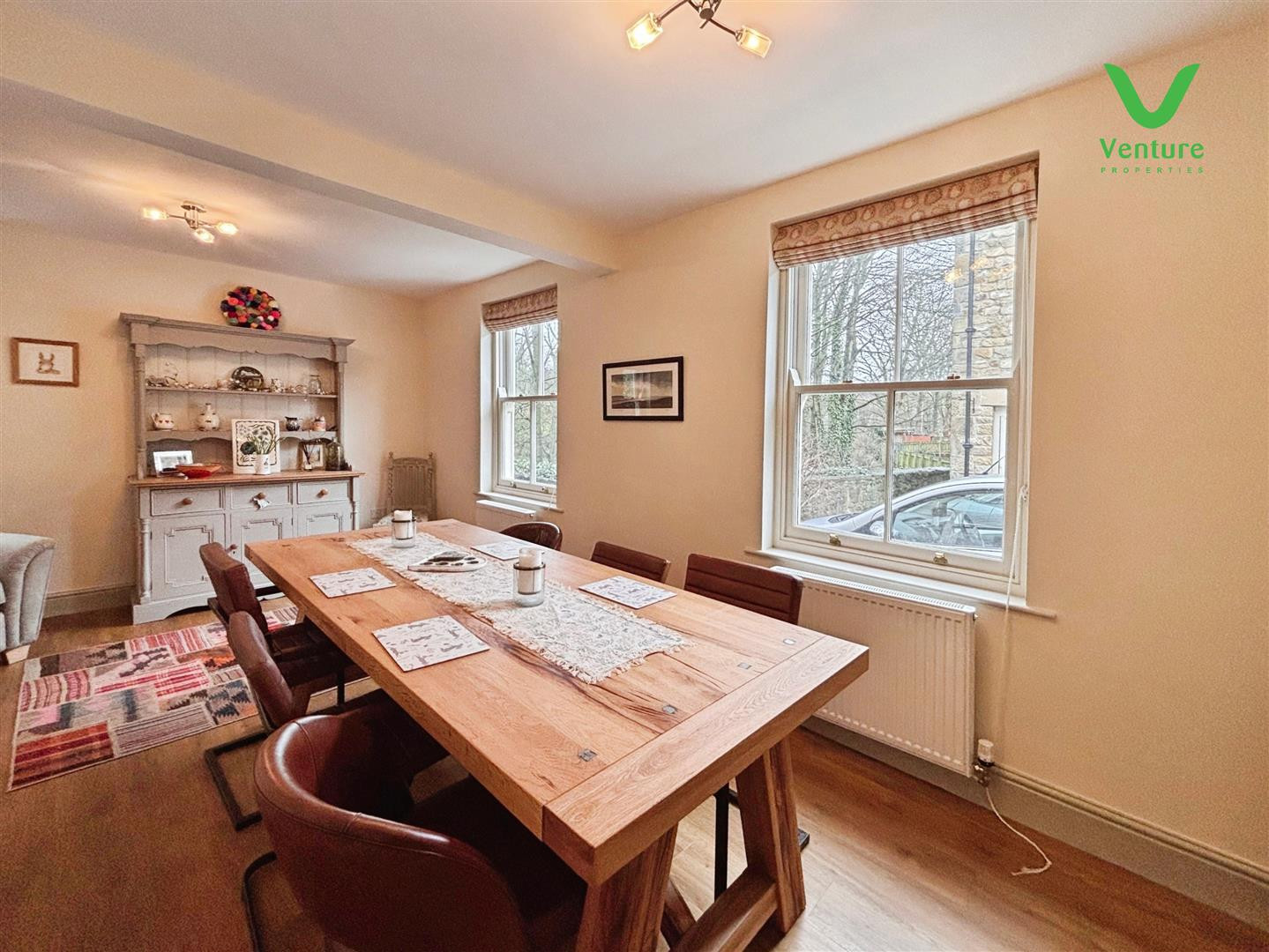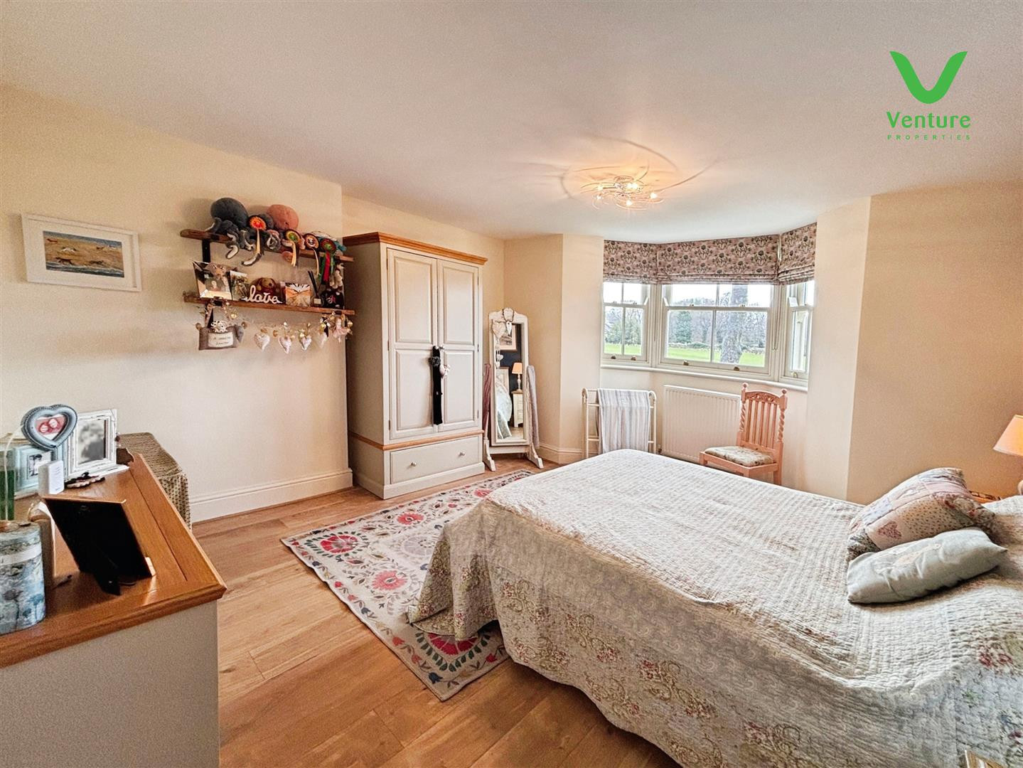Having central heating radiator , laminate flooring and feature bow double glazed sash window to rear having views.
