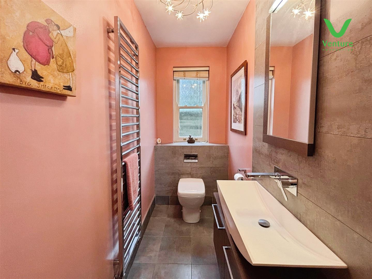 Fitted with a white WC, wash hand basin and chrome heated towel rail and tiled flooring.