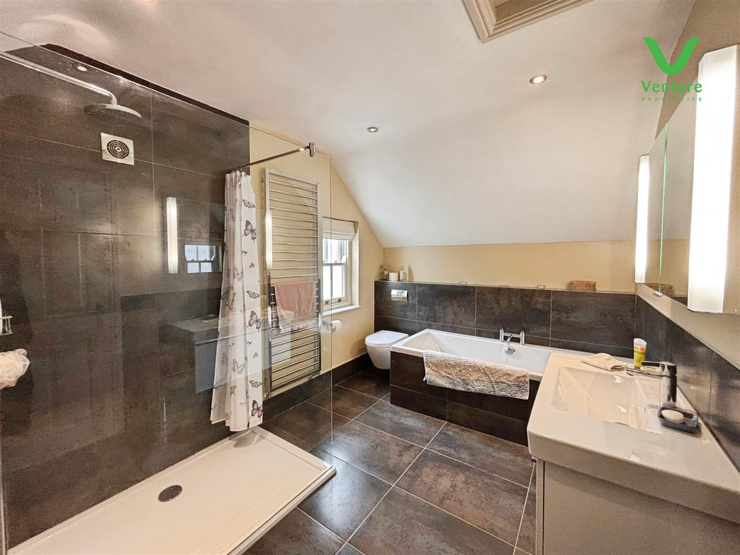 Fitted with a quality suite having walk in shower unit with remote controlled shower, WC, wash hand basin set to vanity unit, tiled walls and flooring and chrome heated towel rail.