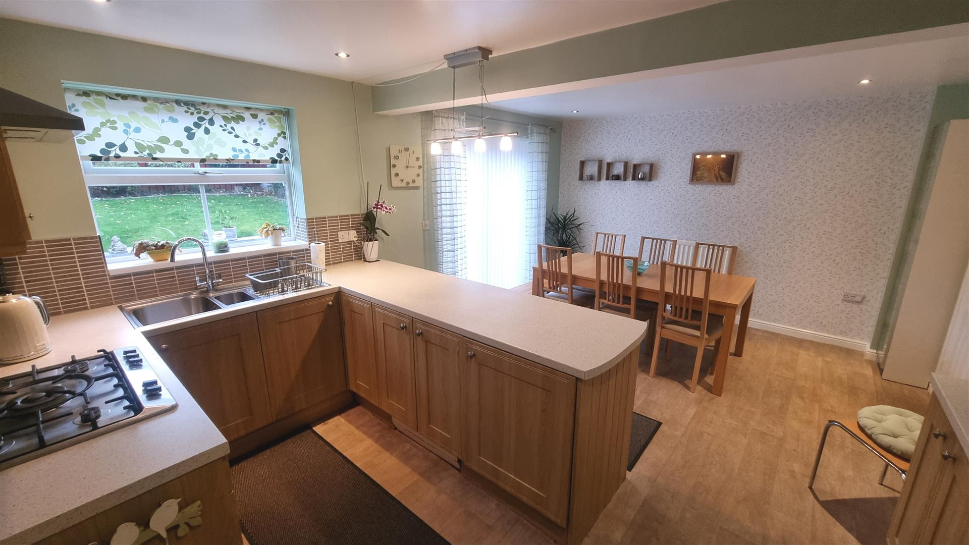 Fitted with base and wall h it’s with laminate work surfaces over and tiled splash backs, integrated fridge, dishwasher and eye level double oven. Sink unit with UPVC window above, breakfast bar seating area and ample space for a dining table with patio doors leading to the rear garden.