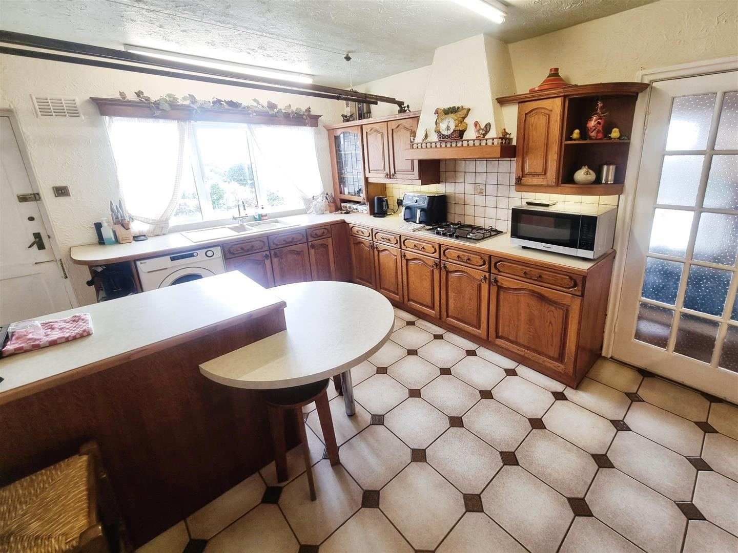 Fitted with wall and base units having contrasting work surfaces over, double integrated electric oven and separate gas hob, one and a half bowl sink unit, plumbing for washing machine, breakfast bar, integrated fridge freezer, wine rack, walk in pantry and window to side.