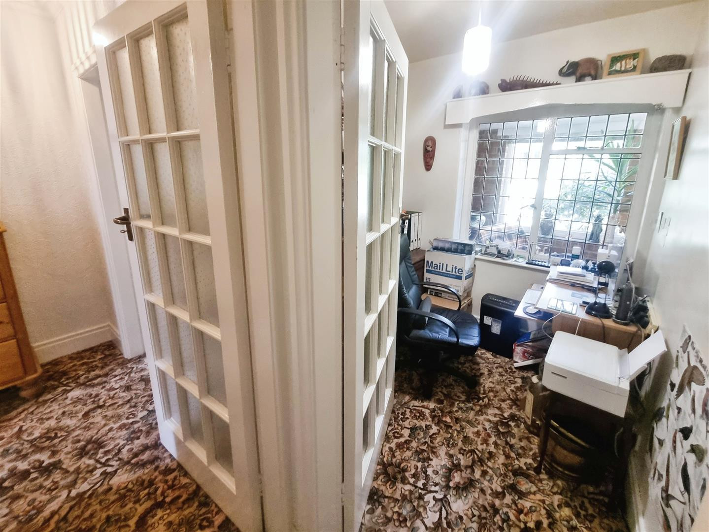 Tiled flooring, front entrance door and two front leaded window to front.