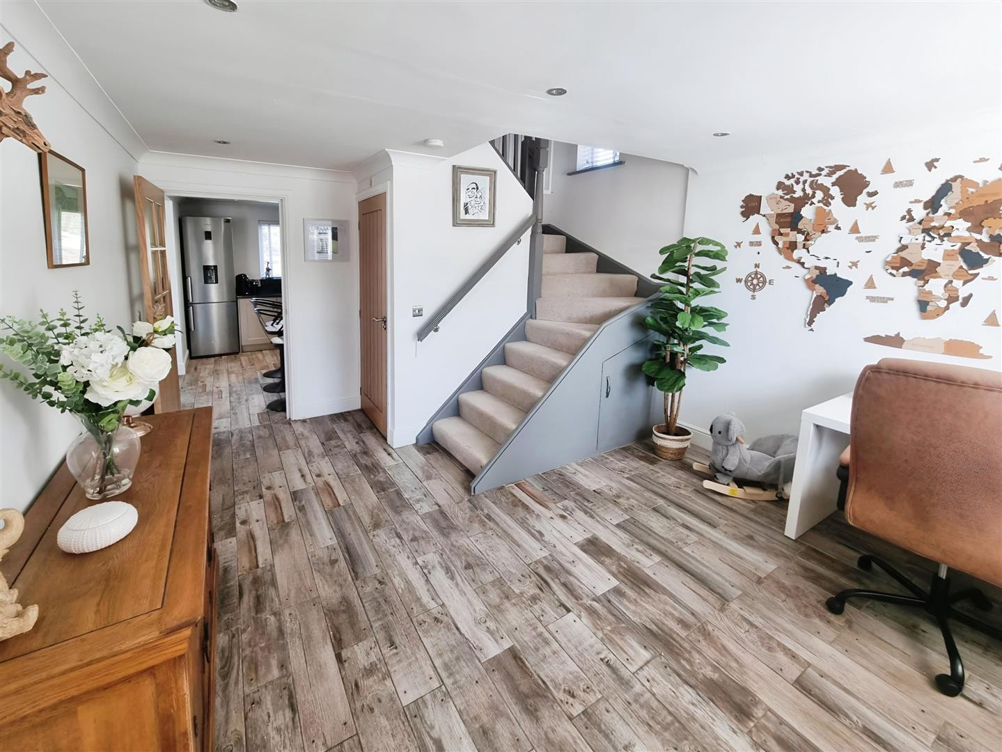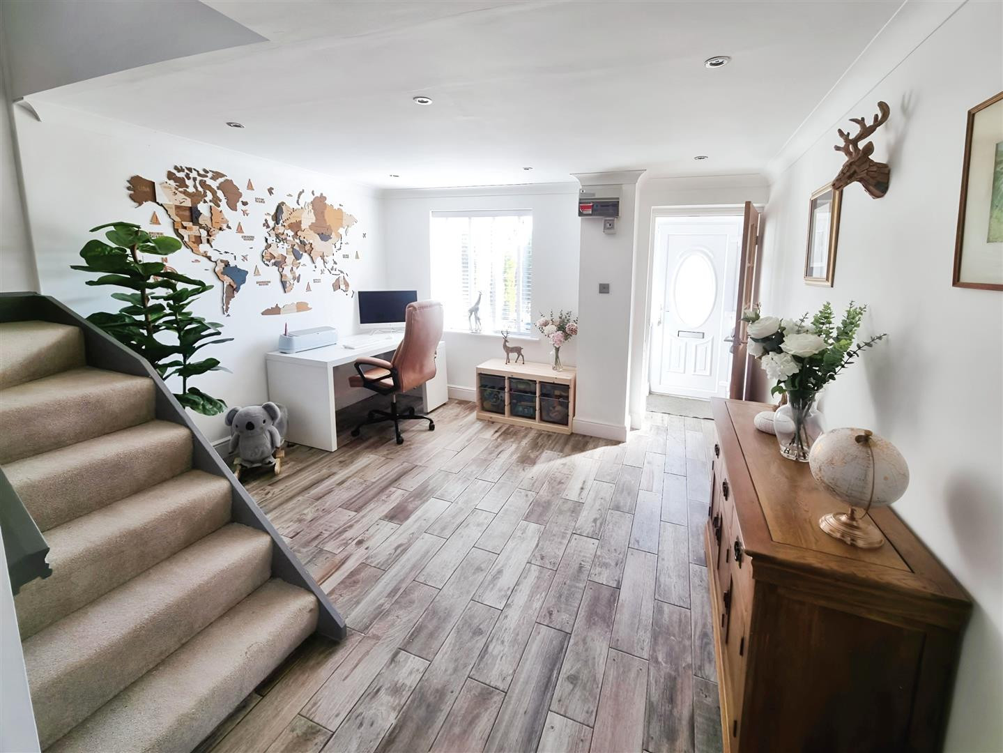 An open hallway and office area having stairs rising to first floor, tiled flooring with underfloor heating, spotlights to ceiling, central heating radiator and uPVC double glazed window to front.