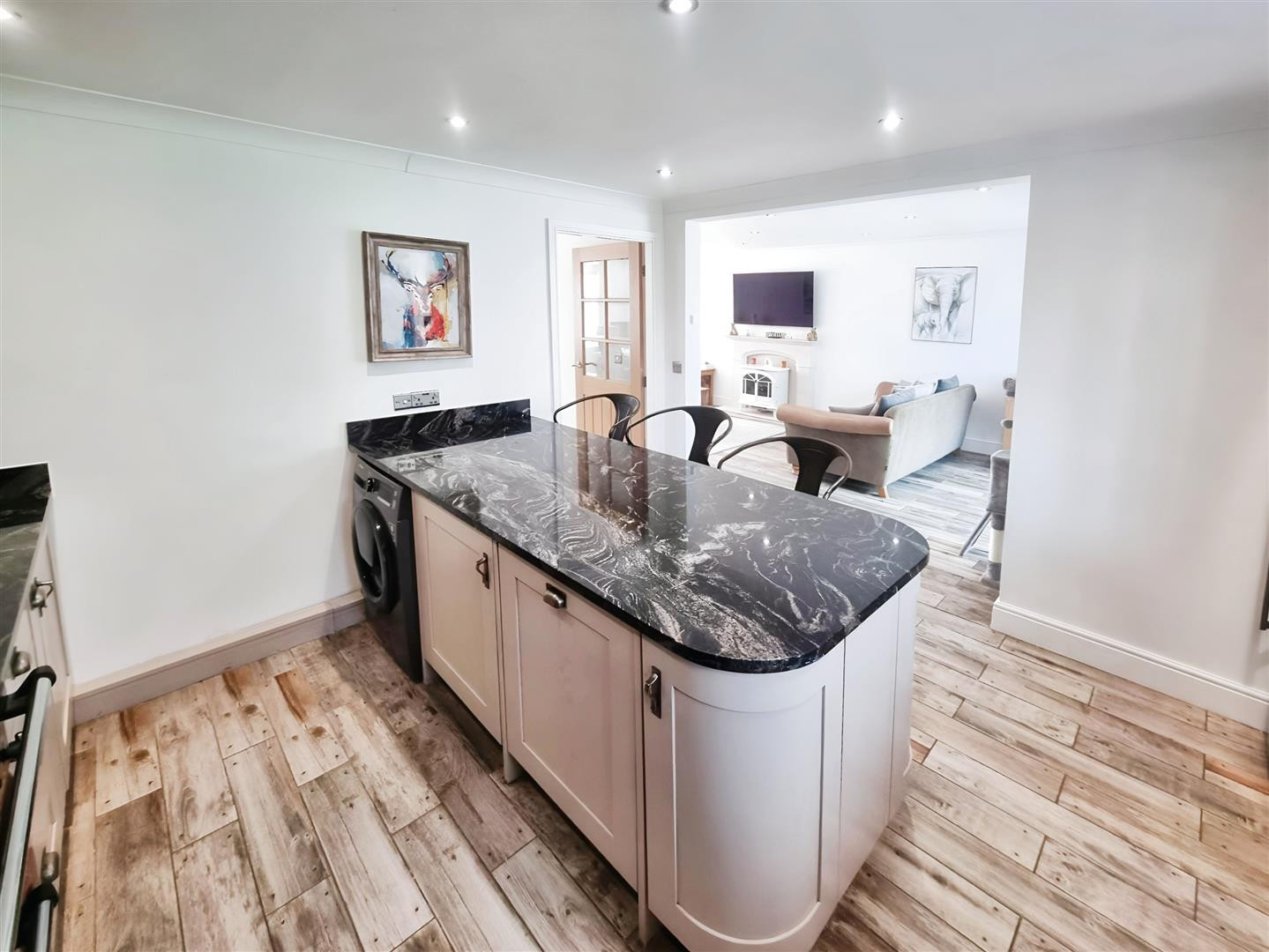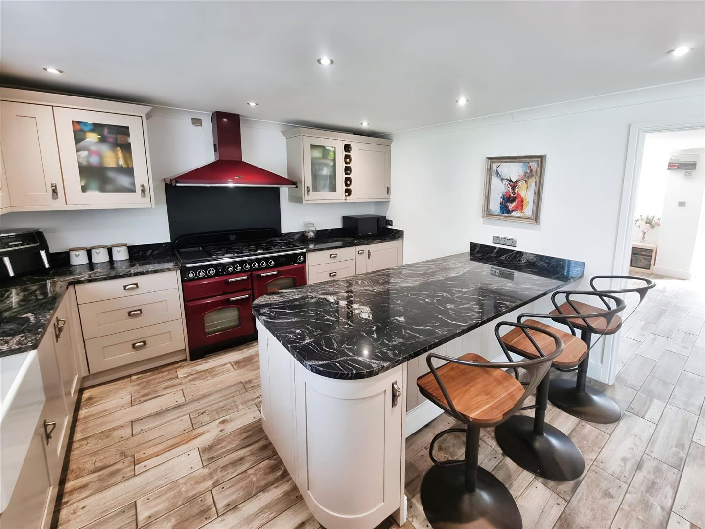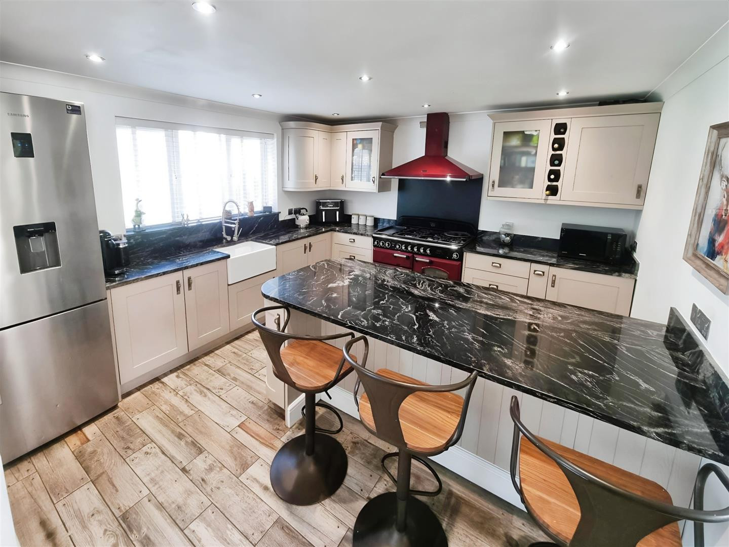 A stunning family sized kitchen fitted with wall and base units with granite work surfaces over, fitted island with storage and seating, Belfast ceramic sink unit with mixer tap, integrated dishwasher, classic range oven by separate negotiation with the sellers, space for fridge freezer, plumbing for washing machine, tiled flooring with underfloor heating and uPVC double glazed window to rear.