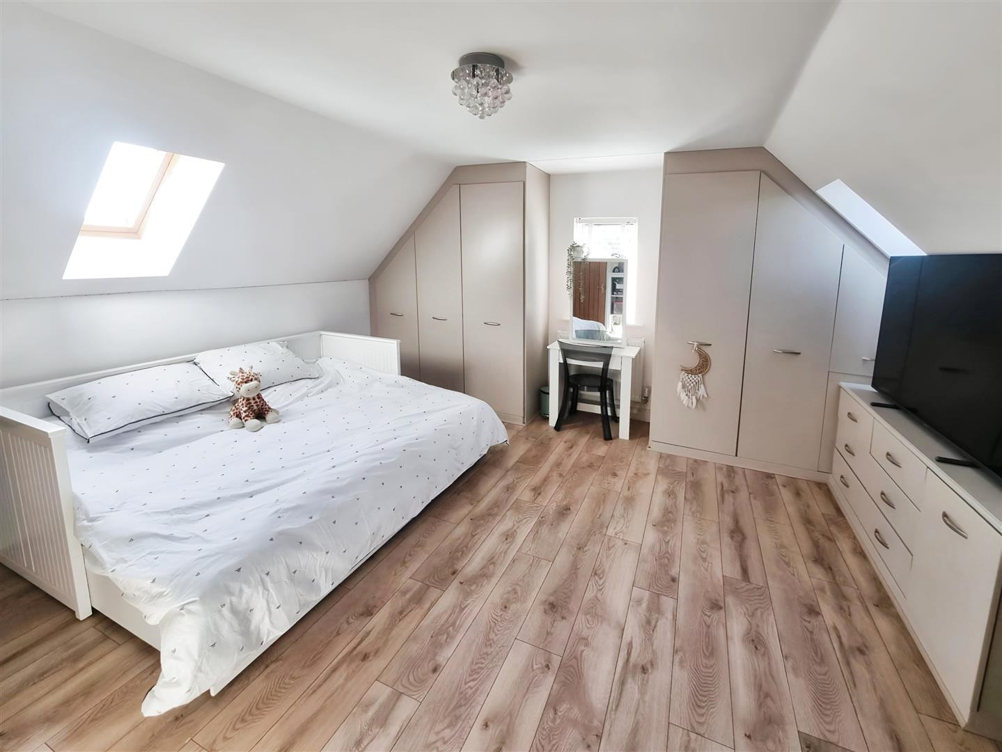 Fitted with a lively range of bedroom furniture, two Velux windows, LVT flooring and central heating radiator .