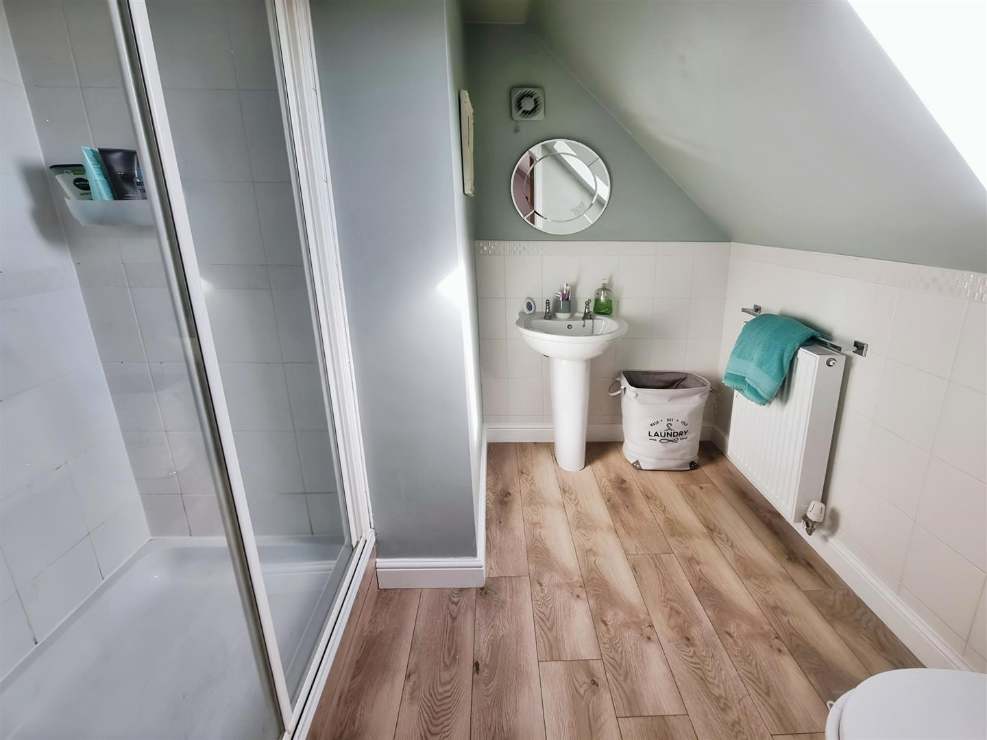 Fitted with a double shower cubicle, WC, wash hand basin, LVT flooring, Velux window and central heating radiator.