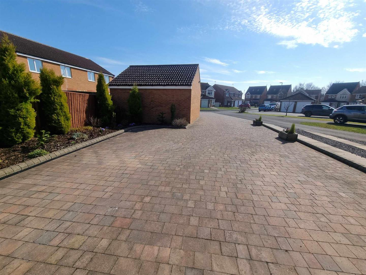 To the front is extensive block paved driveway allowing for ample off road parking. EV charging point. There is a double brick built detached garage with two doors. The current owners currently have the garage set out as a gym.