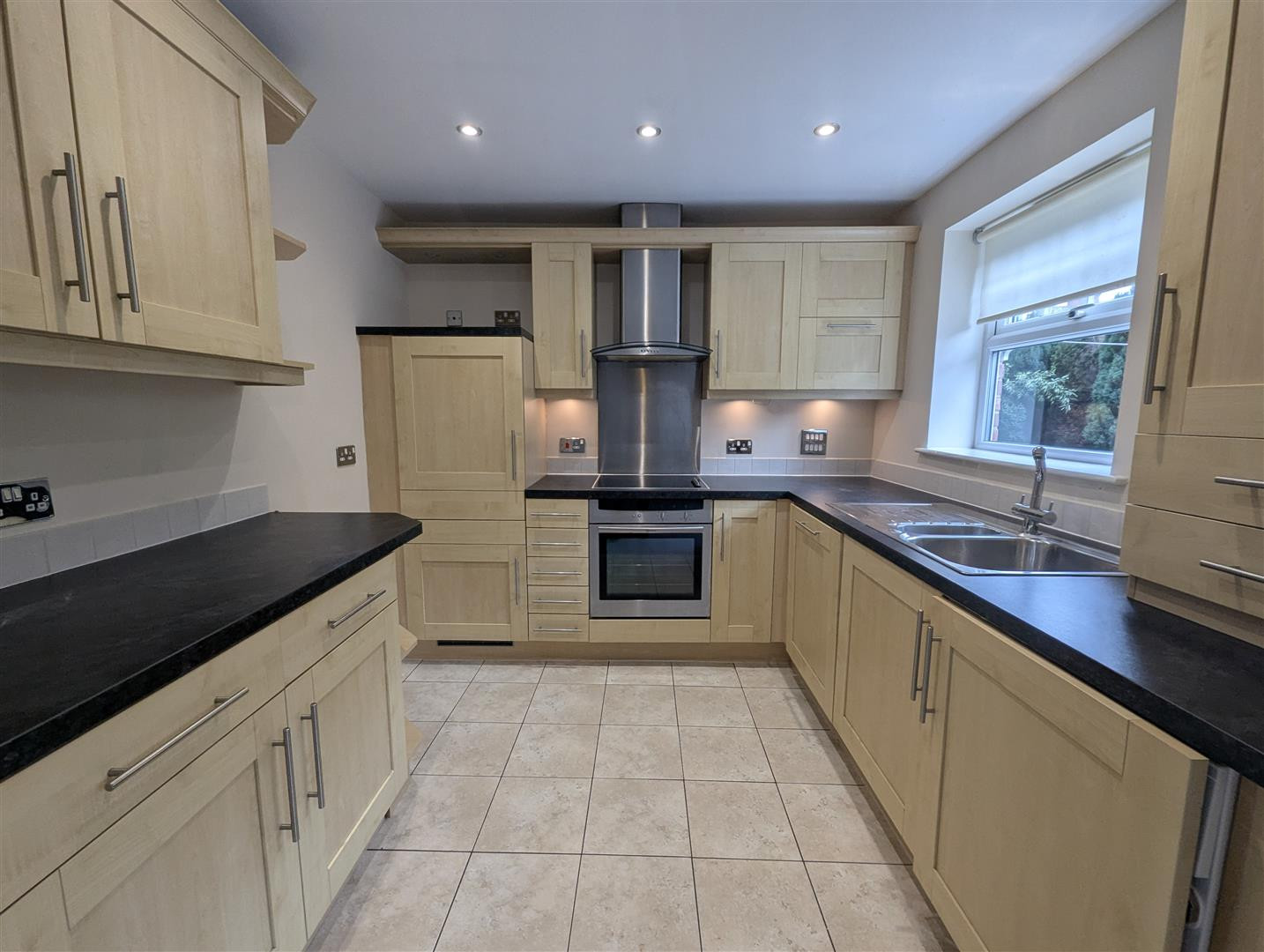 Double glazed window with views over rear garden. Fitted with a range of maple effect shaker style wall, base and drawer units with contrasting work surfaces. Inset stainless steel sink unit with mixer tap, concealed boiler, Neff ceramic hob with fan assisted oven and extractor over. Stainless steel splash back, integrated fridge/freezer, dishwasher and washer/dryer, ceramic tiled floor and spotlights to ceiling.