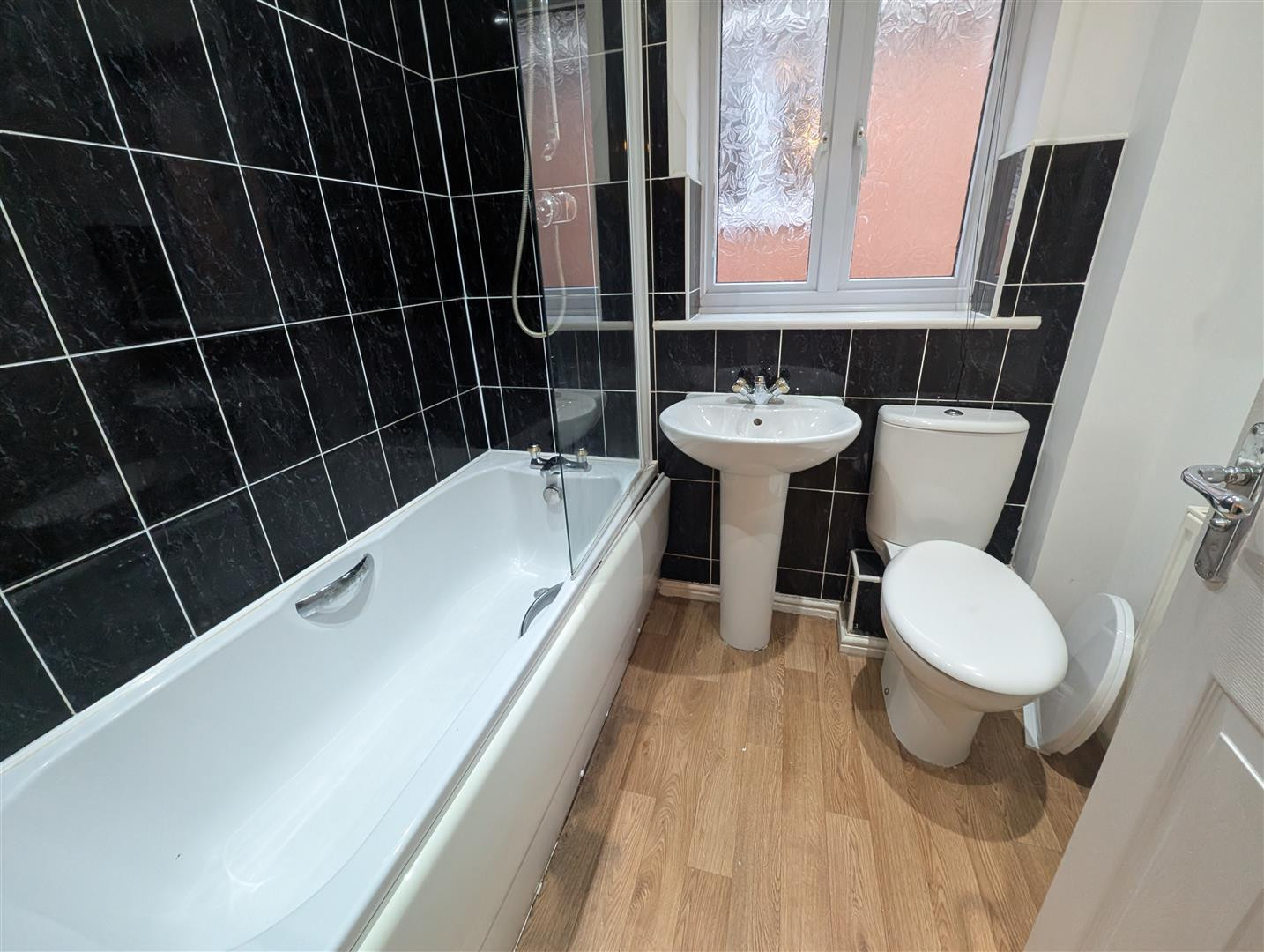 Modern tiled bathroom, with three piece suite including W/C, hand basin with shower over the bath.