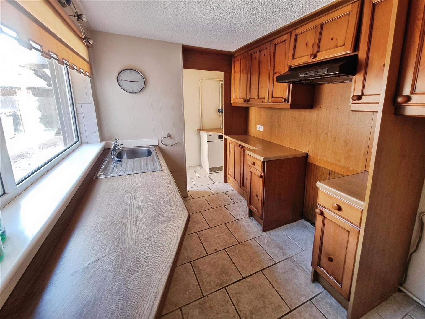 With fitted wall and base units with contrasting work surfaces over, stainless steel sink unit, slot for oven, plumbing for washing machine and uPVC double glazed window to rear.