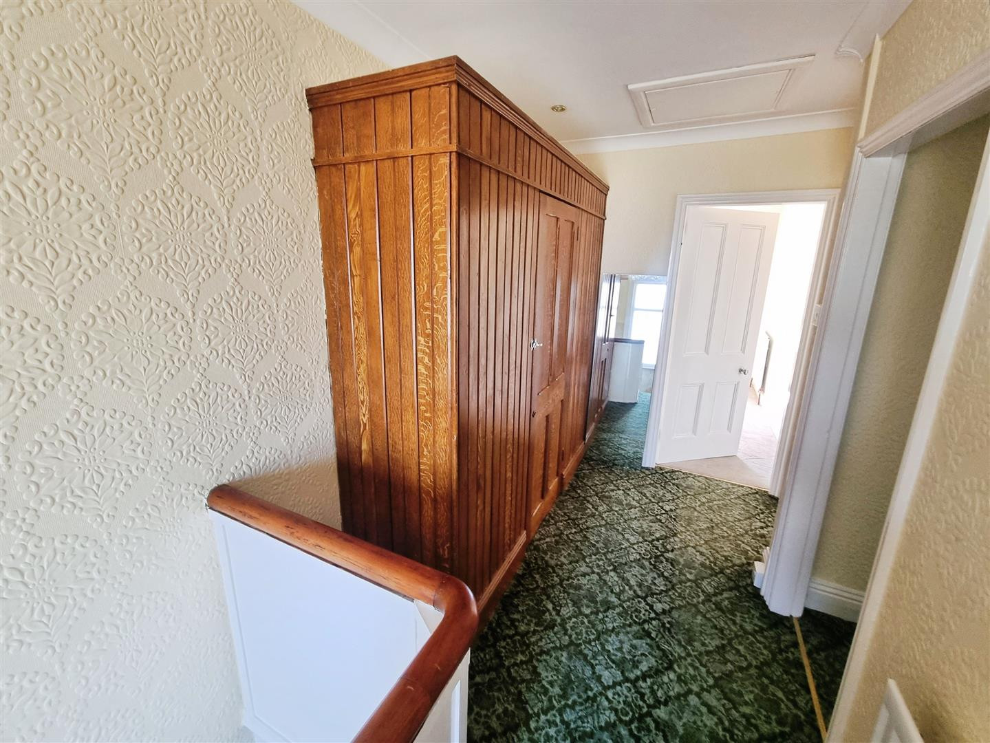 Feature landing area having storage cupboard and uPVC double glazed window to rear.