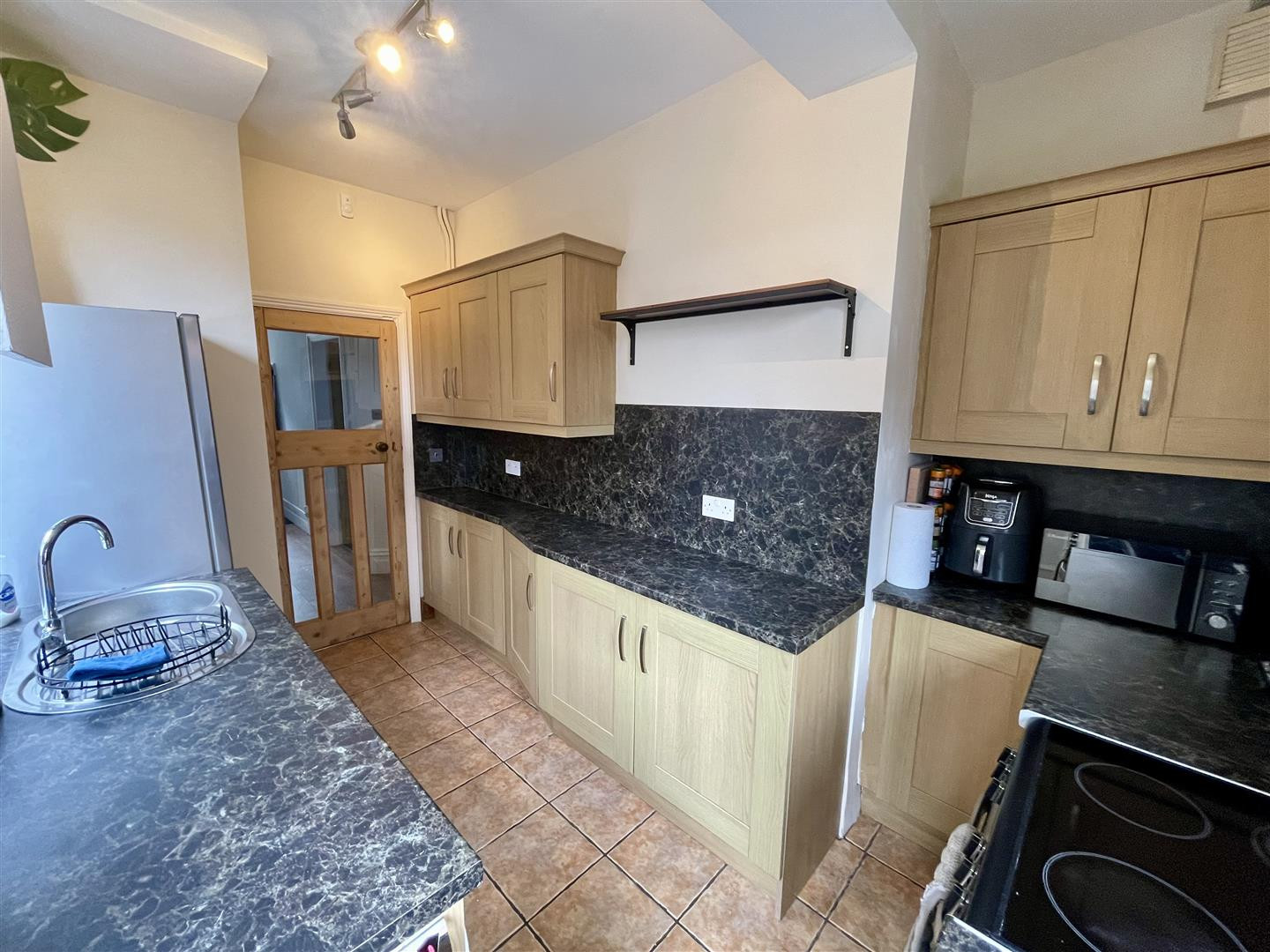 Upvc double glazed window and door to side, medium oak wall, base and drawer units with contrasting work surfaces, stainless steel sink with mixer tap. There is space for a cooker, fridge freezer and washing machine. Part tiled walls and flooring with concealed Boiler.