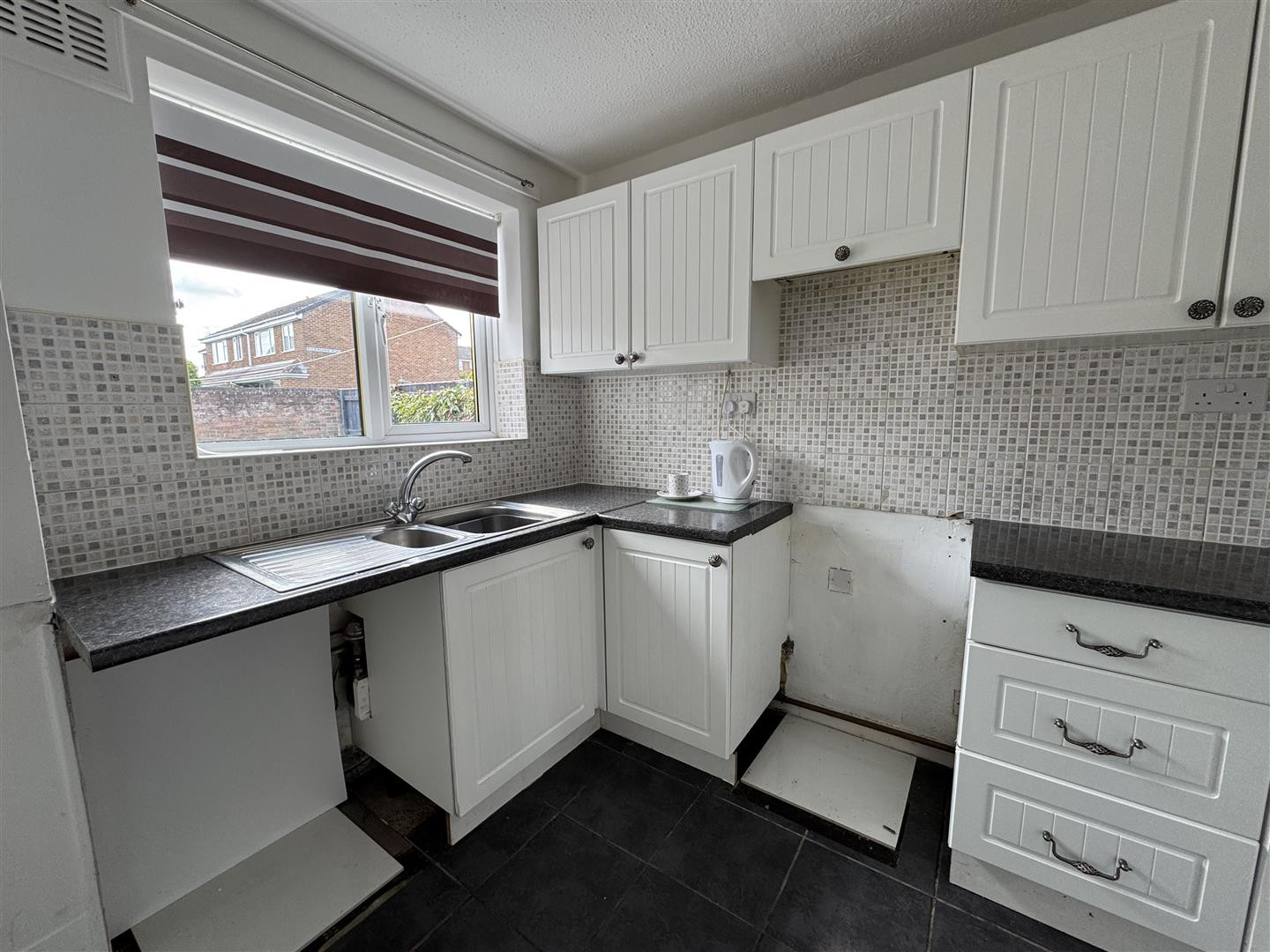 Fitted with a range of White wall and base units, laminated working surfaces over, inset one and a half bowl sink unit, mixer taps above, UPVC double glazed window, tiled splash backs, electric cooker point, tiled floor, plumbing and space for washing machine, glass fronted display cupboard and central heating radiator
