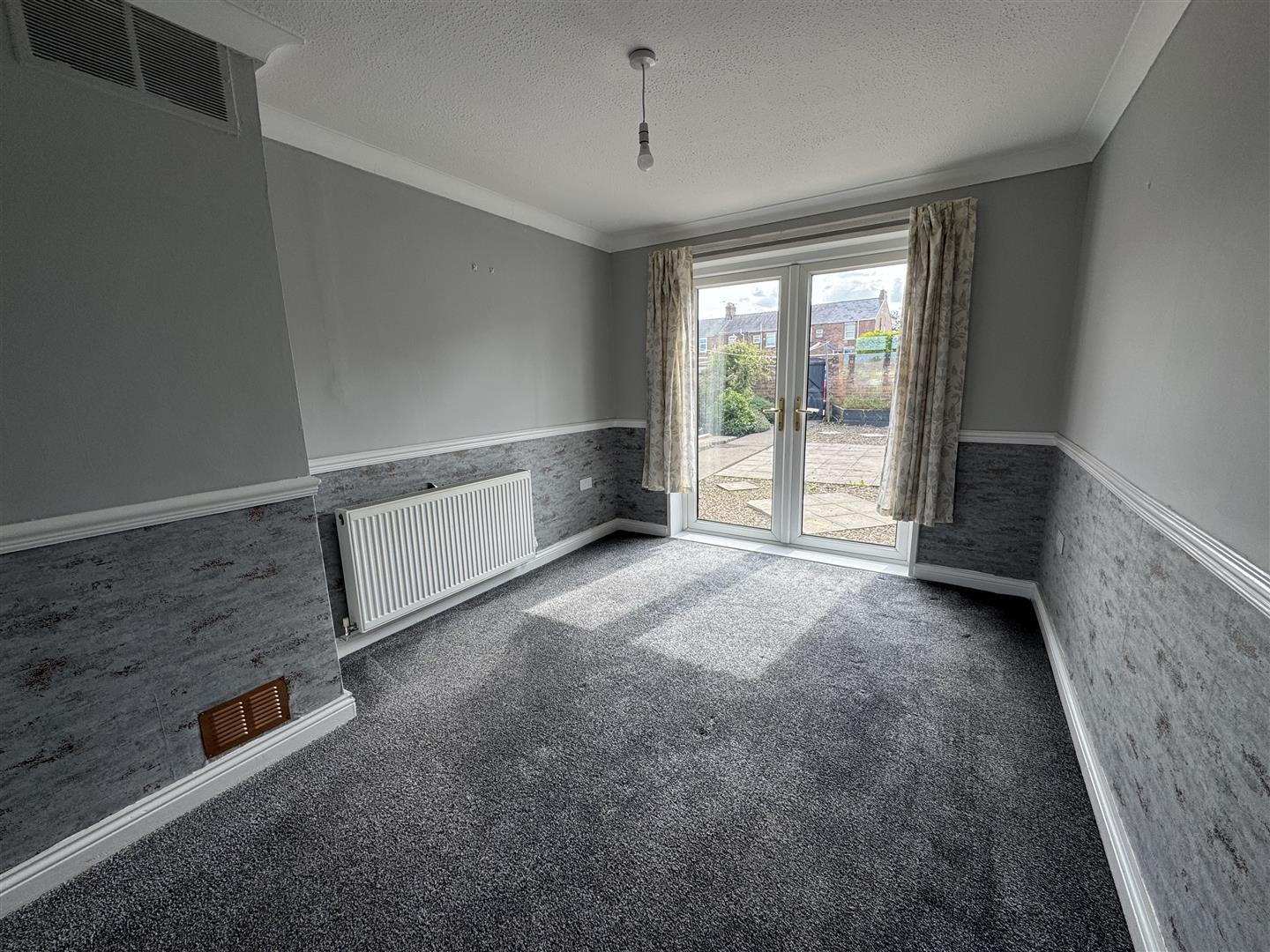 UPVC double glazed bay window to the front elevation, UPVC double glazed French door to the rear, two double central heating radiators, dado rail, coving to ceiling