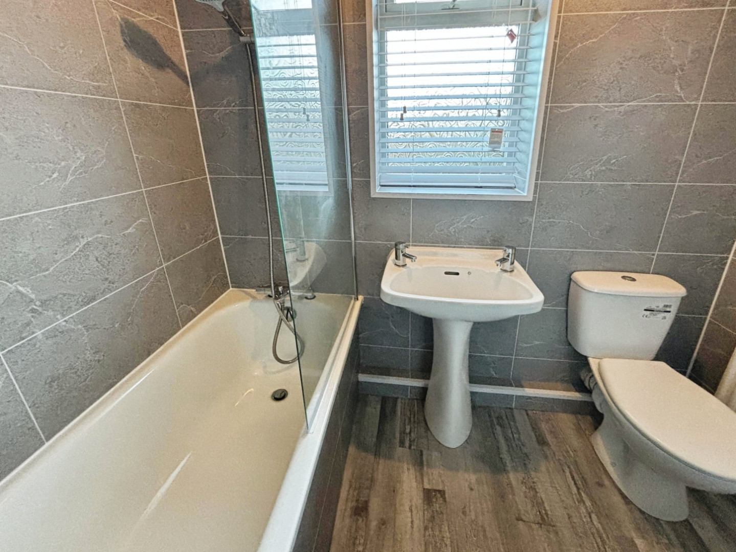 Extensively and recently refitted including panelled bath with mains shower over and sower screen, wc, pedestal wash hand basin, central heating radiators, opaque UPVC double glazed window, decorative grey walls