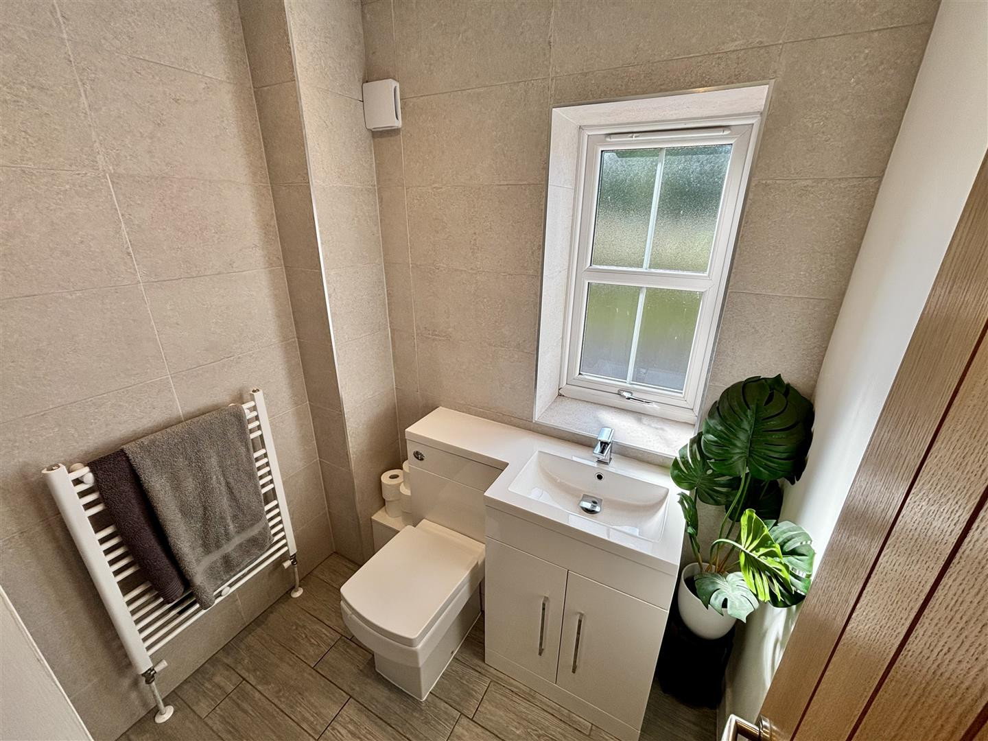Comprising of a WC, hand wash basin inset to a vanity unit, an illuminated vanity mirror, tiled floor and recessed spotlighting.