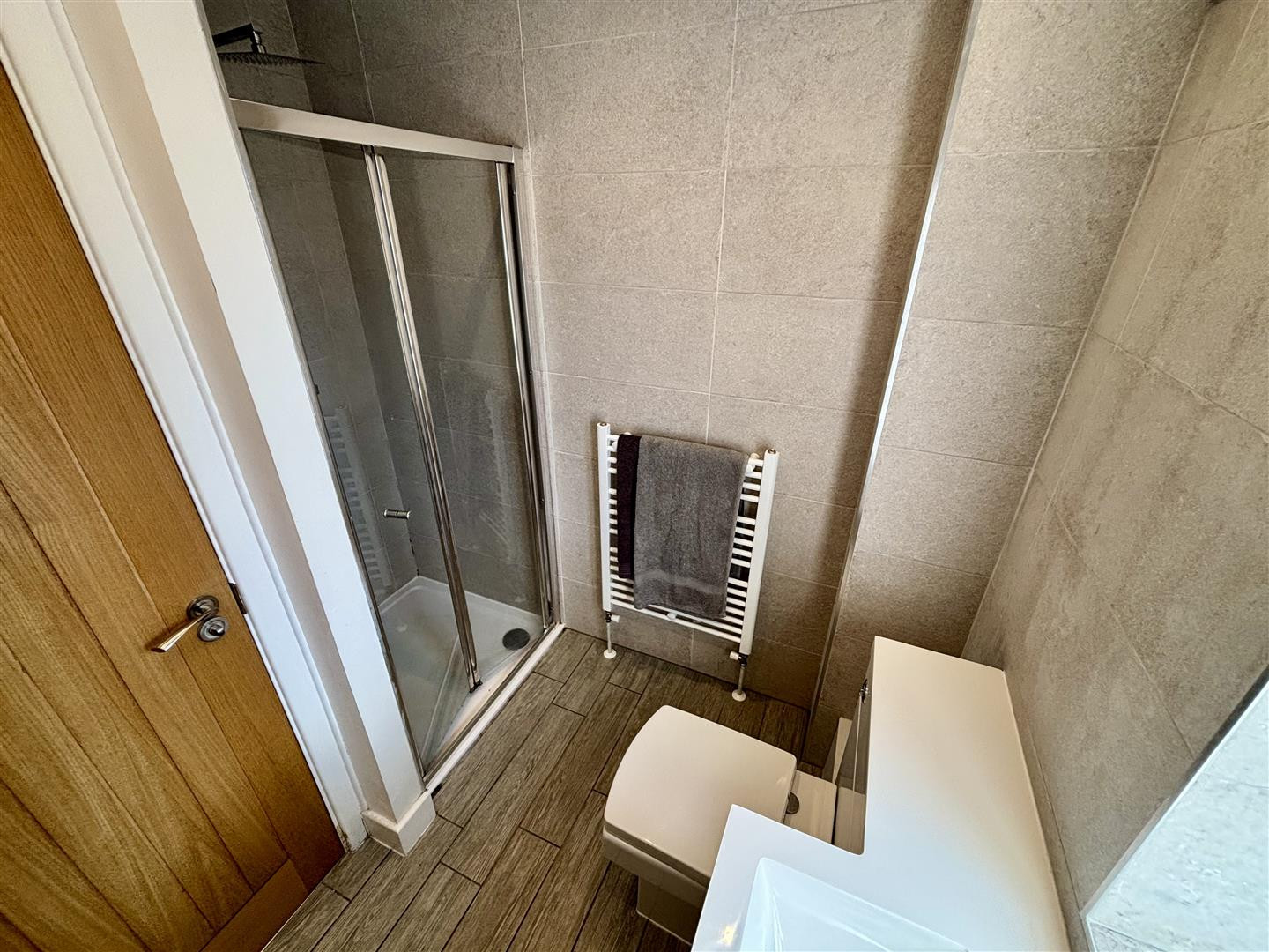 Stylish ensuite comprising of a cubicle with mains fed shower, a hand wash basin and WC inset to a vanity unit. With tiled splashbacks and flooring, a heated towel rail, recessed spotlighting, extractor fan and UPVC double glazed window to the front.