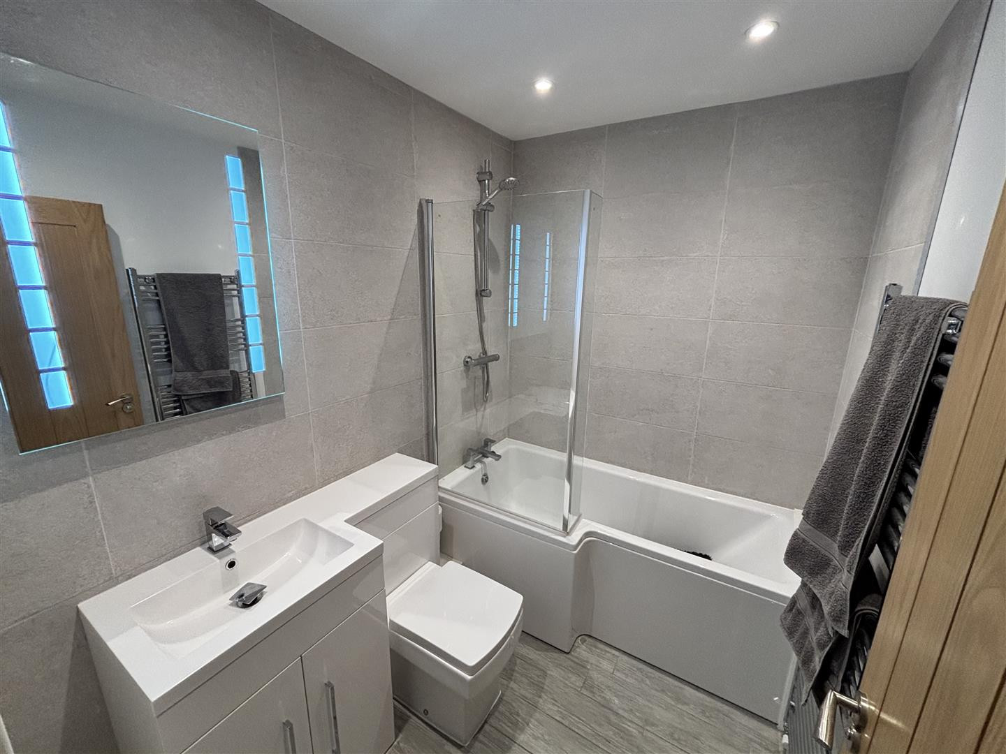 Luxurious family bathroom comprising of an panelled bath with mains fed shower over, a wash basin and WC inset to a vanity unit. Having tiled splashbacks and flooring, a heated towel rail, recessed spotlighting and extractor fan.