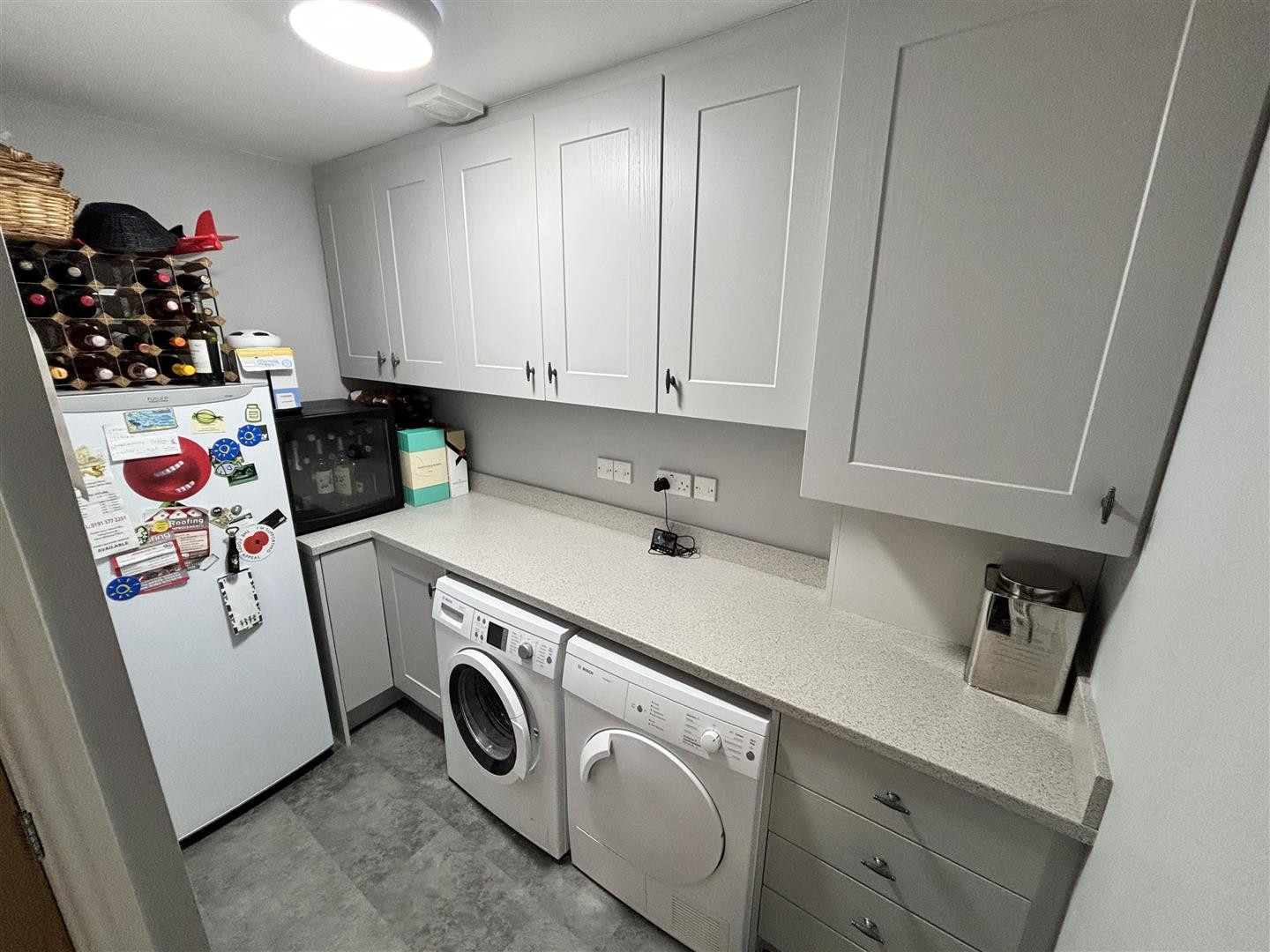 The current owners have created a very useful utility room to the rear of the garage, which is accessed from the hallway. Having a range of wall and floor units with contrasting worktops, plumbing for a washing machine, space for a tumble dryer, a fridge/freezer space, an extractor fan and radiator. Also housing the combi gas central heating boiler.