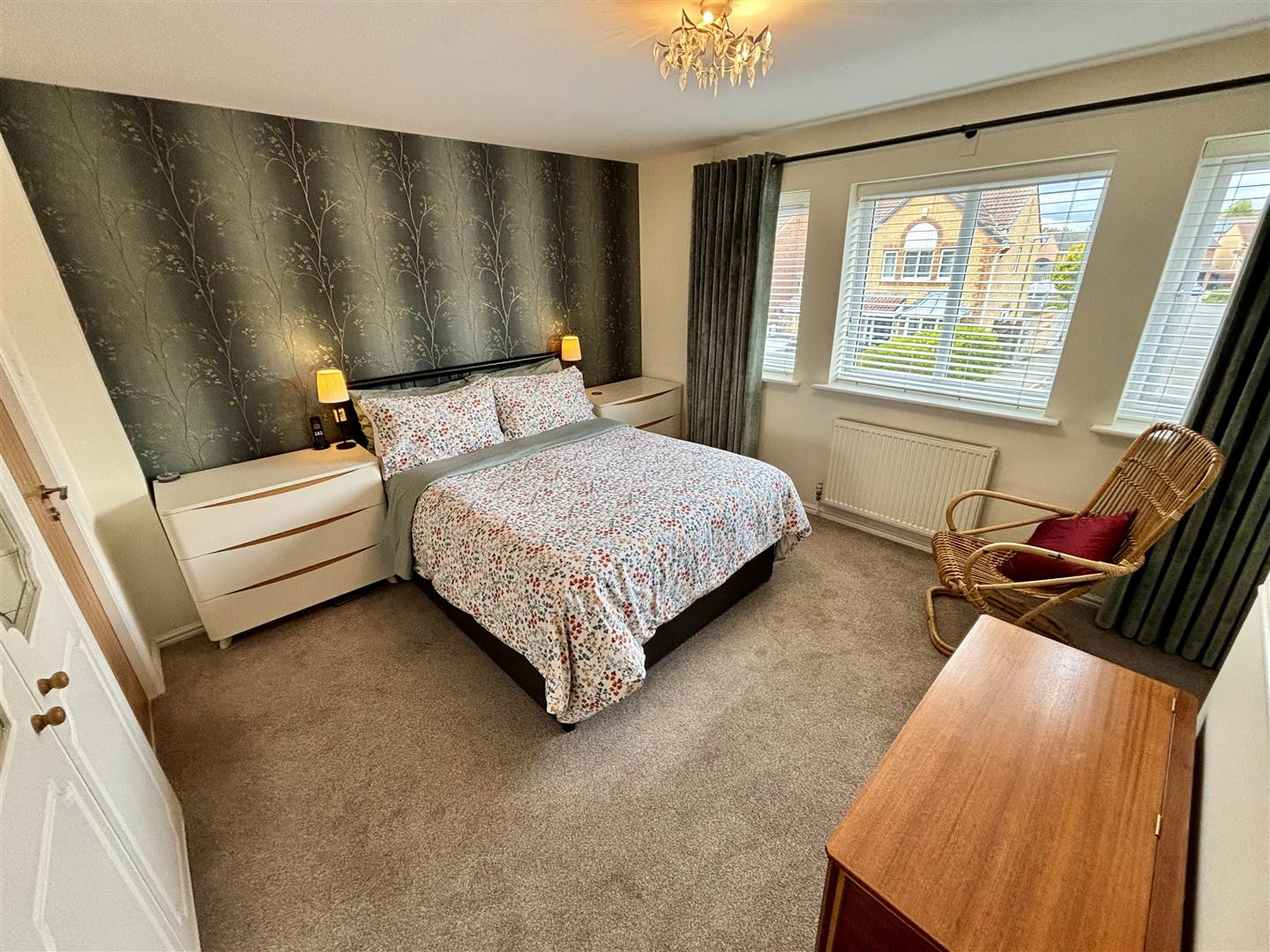 Generously proportioned master bedroom having three UPVC double glazed windows to the front, two built in double wardrobes, radiator and TV recess.