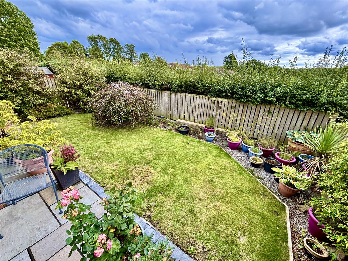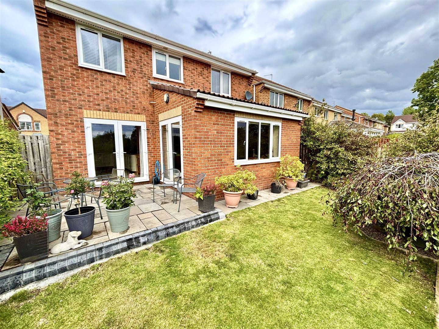 To the front of the property is a lawned garden and double driveway for off street parking, whilst to the rear is an enclosed, landscaped garden with lawn, well stocked borders and a patio area. The garden backs on to a children’s park making it ideal for family buyers.