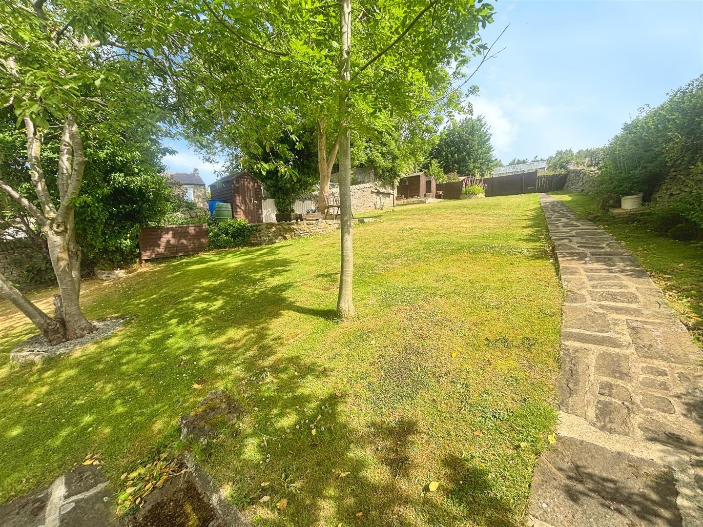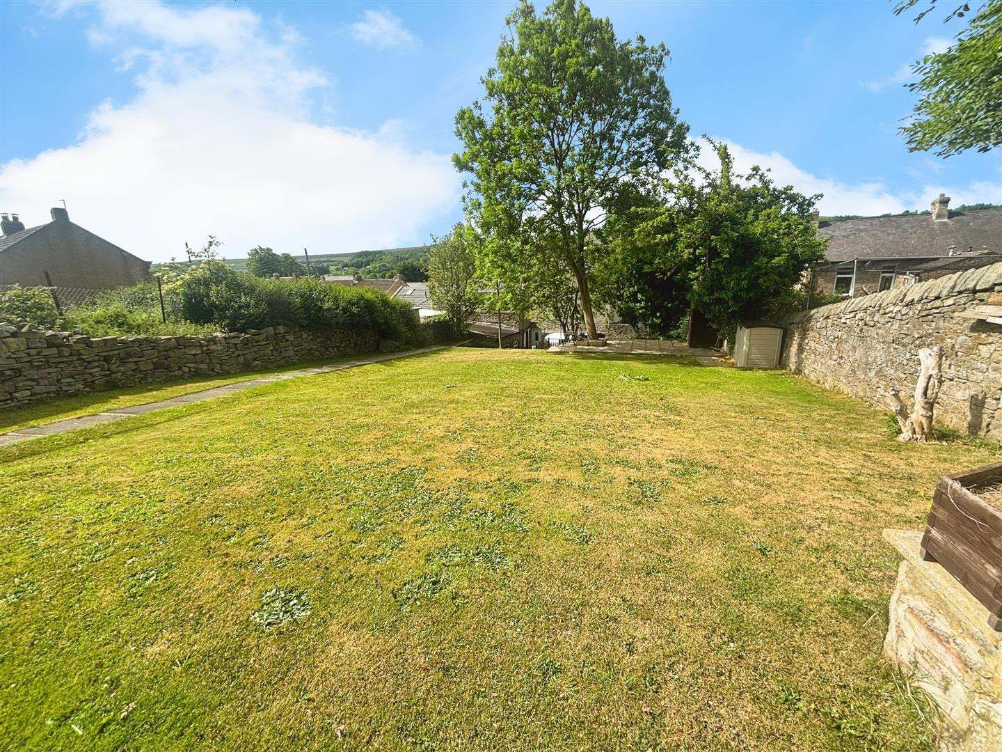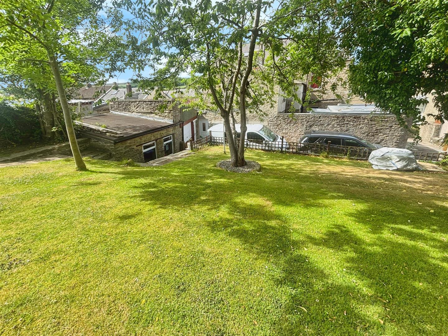 To the rear of the property which is vehicular access to the side allows off road parking for two cars. Stone steps lead to the rear garden bounded by dry stone walling and fencing, mainly laid to lawn with raised paved seating areas or hard standing for a shed.