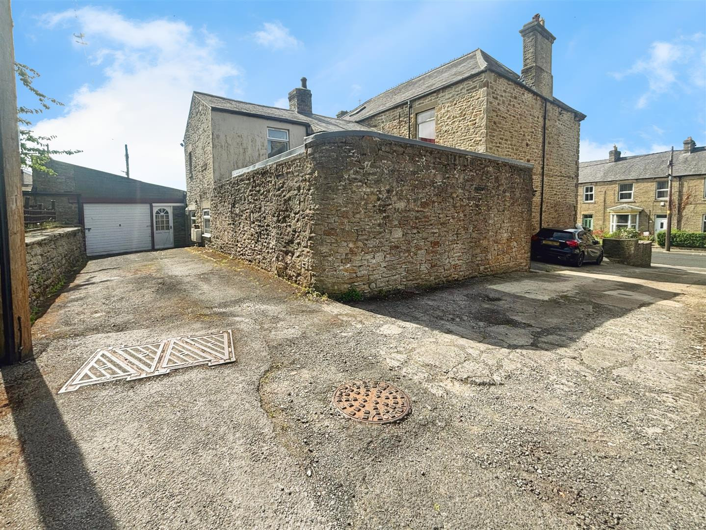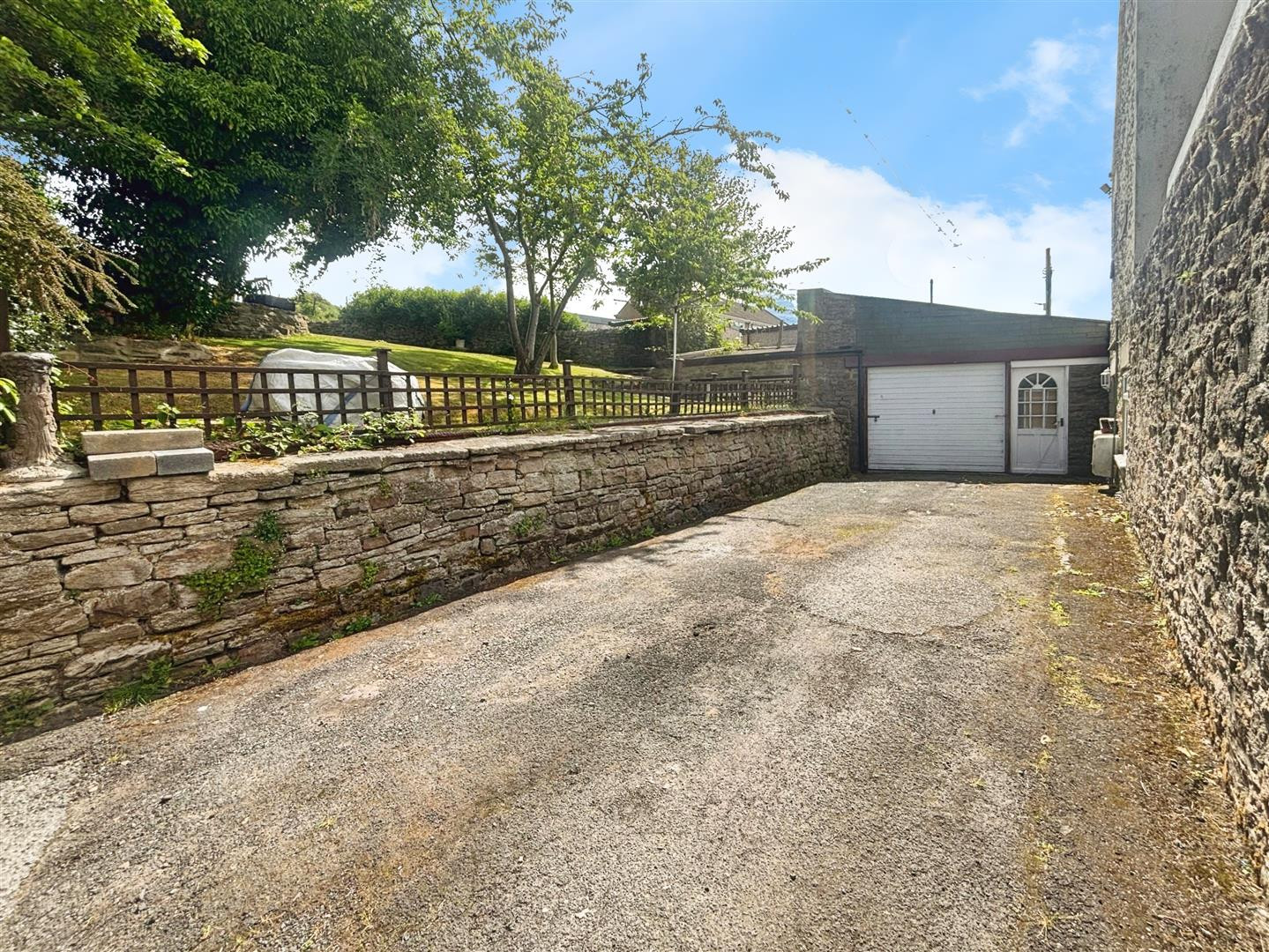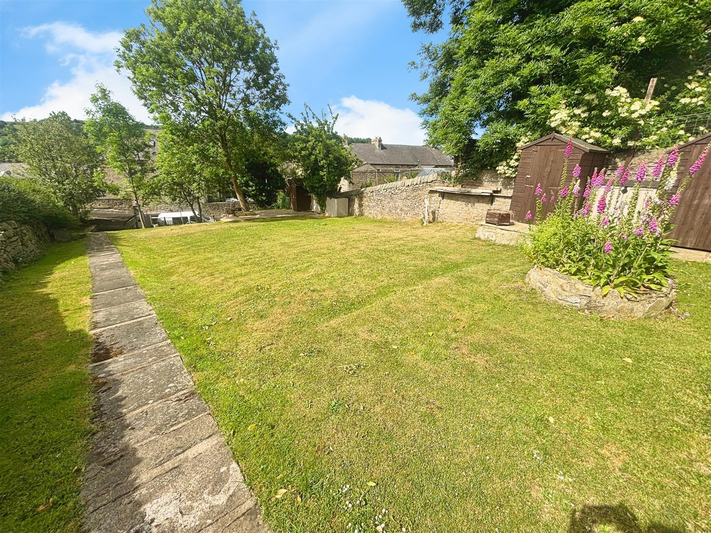 To the rear of the property which is vehicular access to the side allows off road parking for two cars. Stone steps lead to the rear garden bounded by dry stone walling and fencing, mainly laid to lawn with raised paved seating areas or hard standing for a shed.