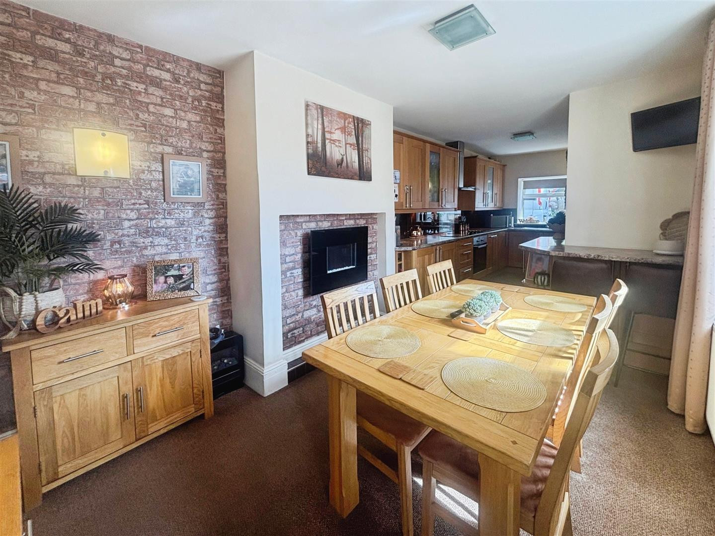 The dining room has UPVC window and door to the side of the property, central heating radiator, wall mounted electric fire with ample space for an extendable family dining table. A double opening leads into the kitchen and utility area fitted with an extensive range of solid wood base and wall units, with laminate work surfaces over and glass splash backs. Integrated electric oven and hob with extractor above, washing machine, fridge and freezer and housing for a dishwasher. There is a breakfast bar seating area, decorative shelving, wine storage, stainless steel sink unit with UPVC window with views over the rear garden above and further base units in the utility/rear entrance of the property.