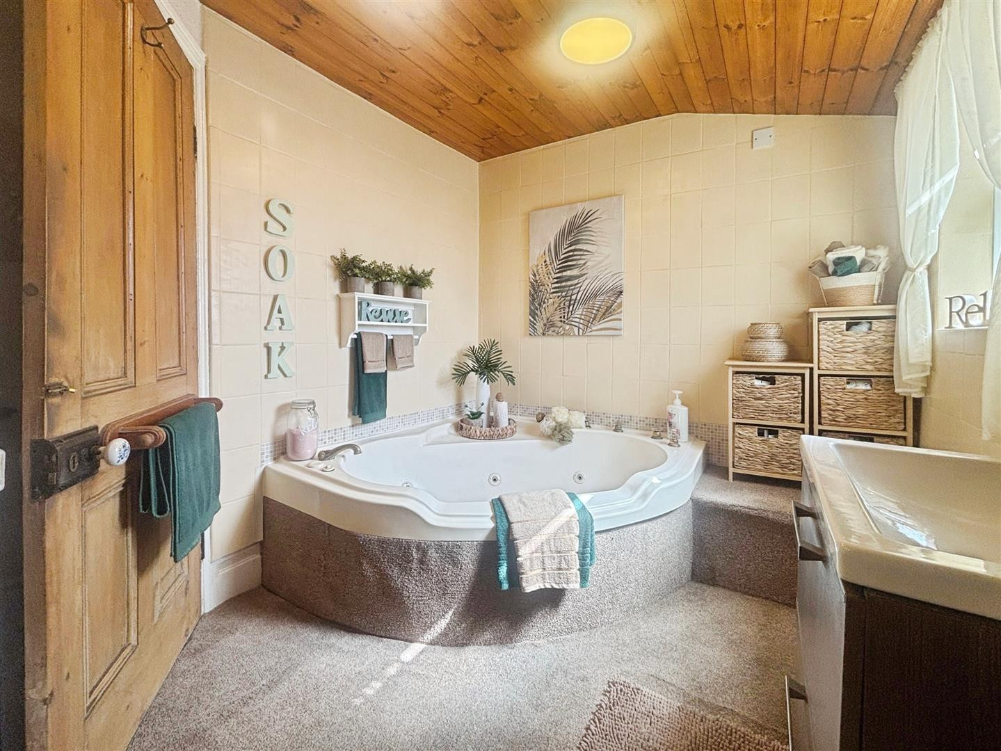 Fitted with a three piece suite comprising corner bath, wash hand basin set on a vanity storage cabinet, WC, wall mounted mirror with further storage, central heating radiator and obscured UPVC window.