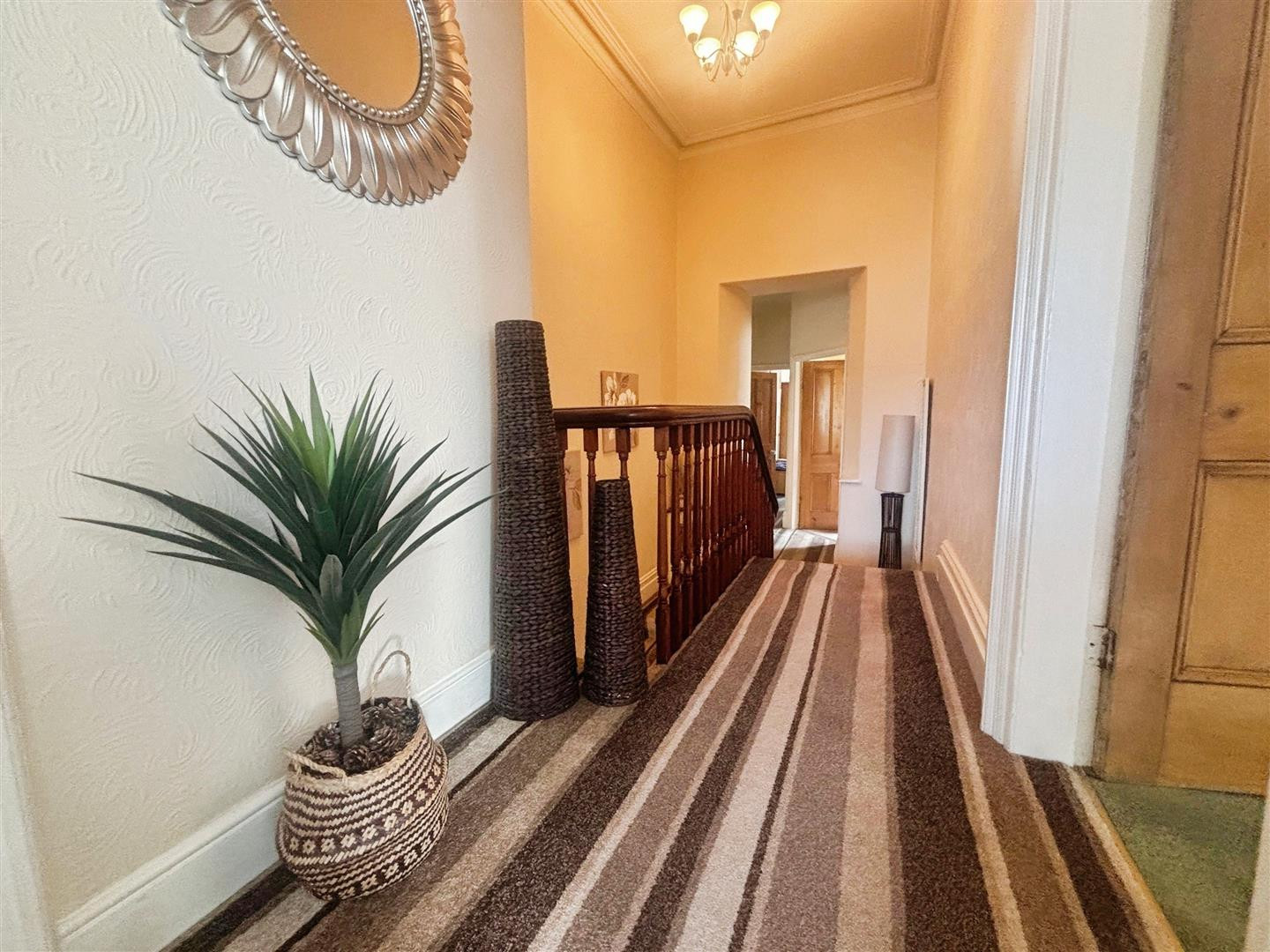 A spacious and welcoming inner hallway, stairs rise to the first floor, central heating radiator, solid wood carved balustrade and original coving and decorative archway.