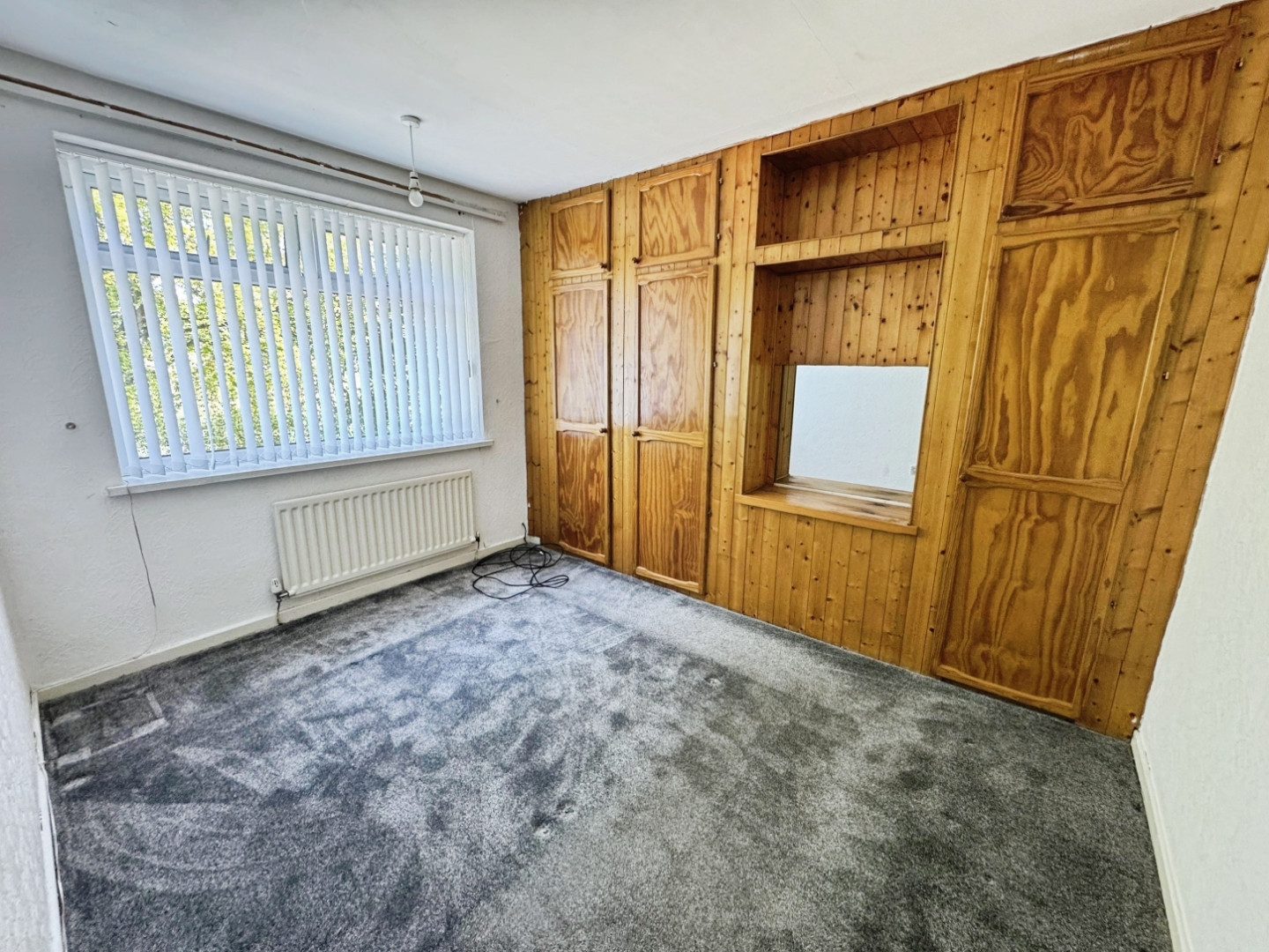 UPVC double glazed window, central heating radiator and storage cupboard housing gas boiler
