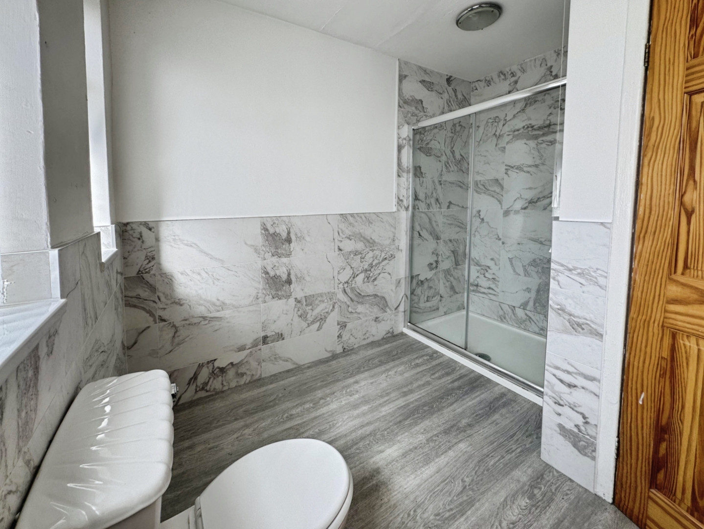 With double walk in shower cubicle with electric shower, pedestal wash hand basin, wc, central heating radiator, storage cupboard and two opaque UPVC double glazed window, panelling to half height