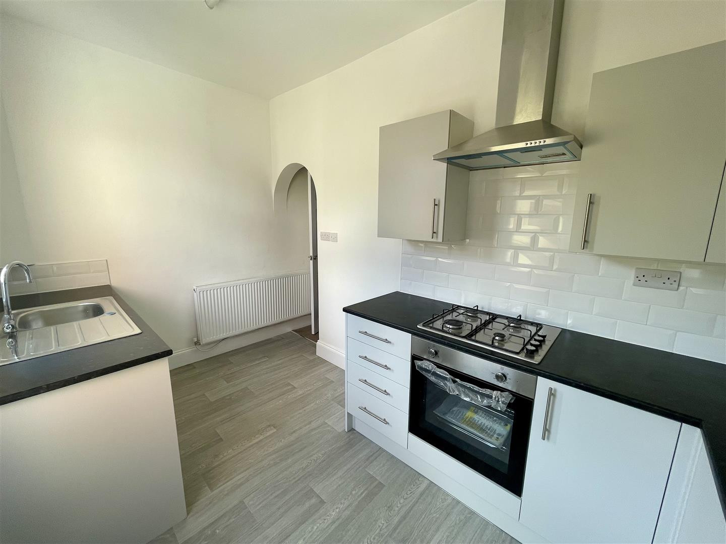 Two Upvc double glazed windows to rear, fitted with wall, base and drawer units, four ring gas hob with extractor over and oven. Stainless steel sink, space for a washing machine, radiator and door to rear.