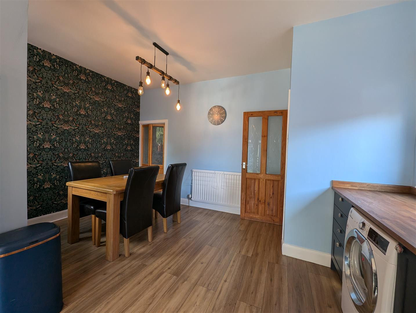 Composite door to side, laminate flooring and radiator.