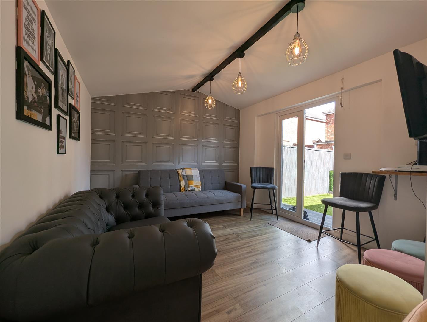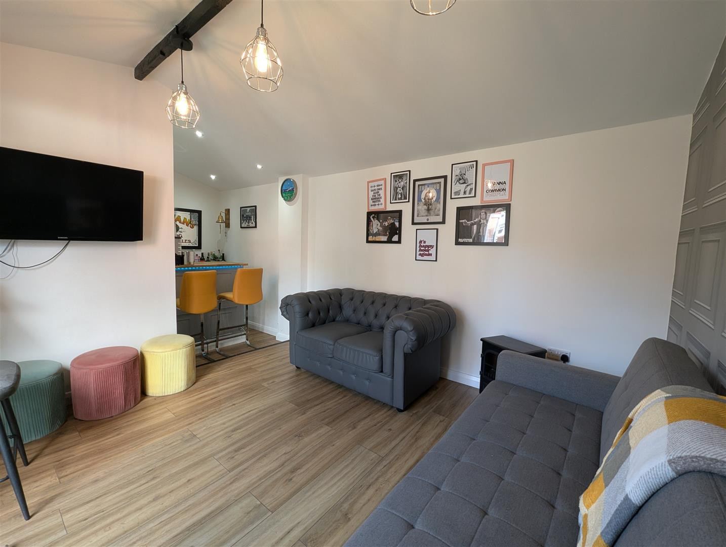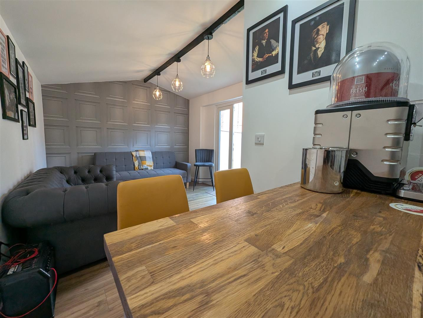 With fixed Bar, power and light, charging sockets, laminate flooring and Upvc double doors. Plenty of room for seating.