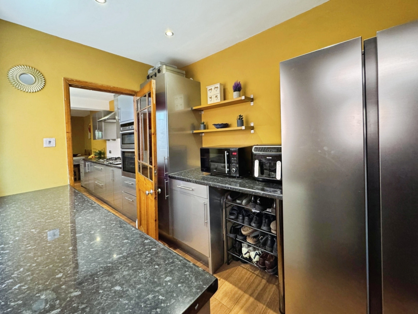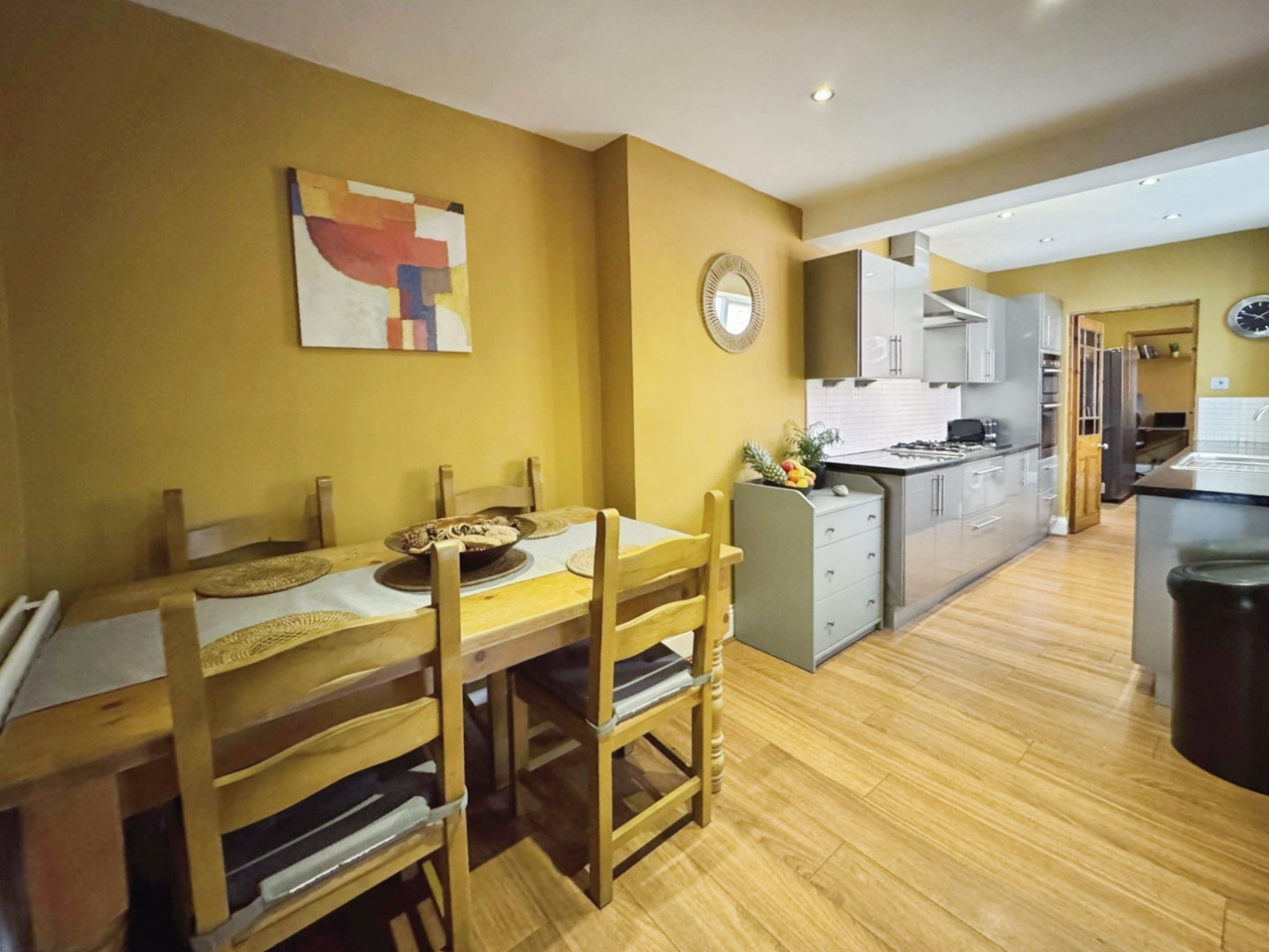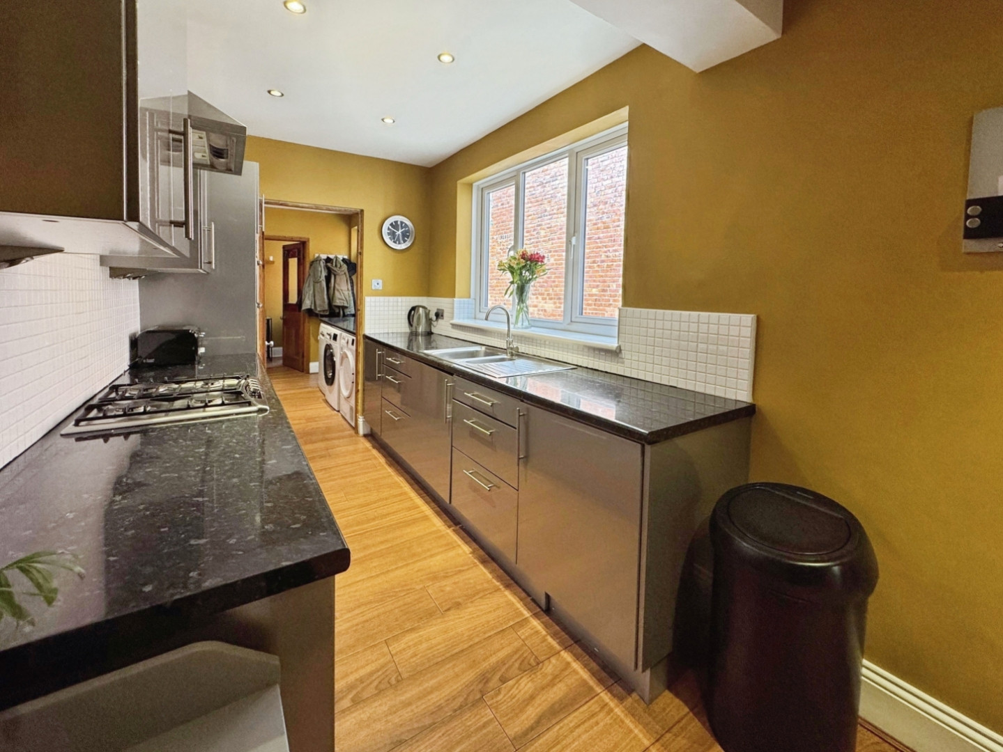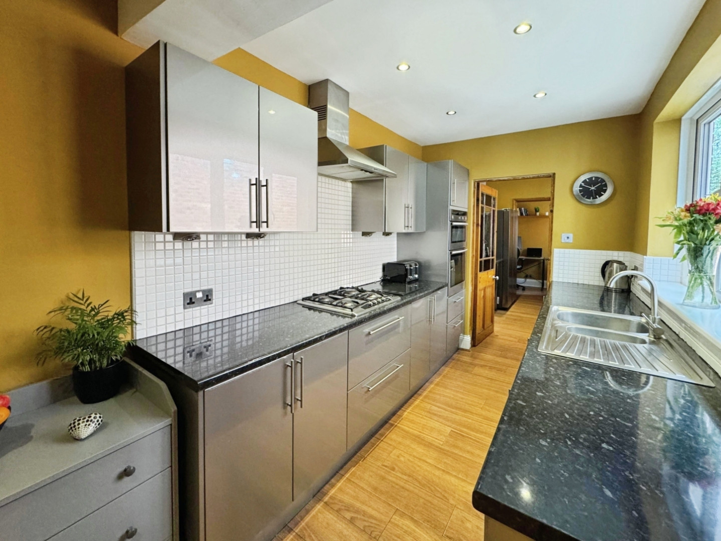 Extensively fitted with a modern range of silver high gloss wall and base units having laminate working surfaces, stainless steel sink unit with mixer, attractive tiled splashbacks, integrated double electric oven and grill and integrated gas hob with extractor hood over, laminate wood flooring, spot lights to ceiling, under wall unit lighting, central heating radiator, UPVC double glazed window to side and ample space for table and chairs or seating as required