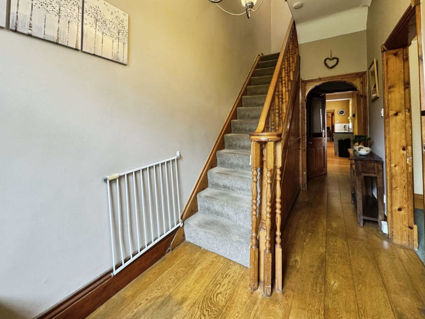 A lovely spacious and welcoming entrance hallway with UPVC double glazed entrance door, real wood flooring, ceiling rose, central heating radiator, feature architraves and coving, door to inner hall with large under stairs storage cupboard, telephone point and staircase to the first floor.