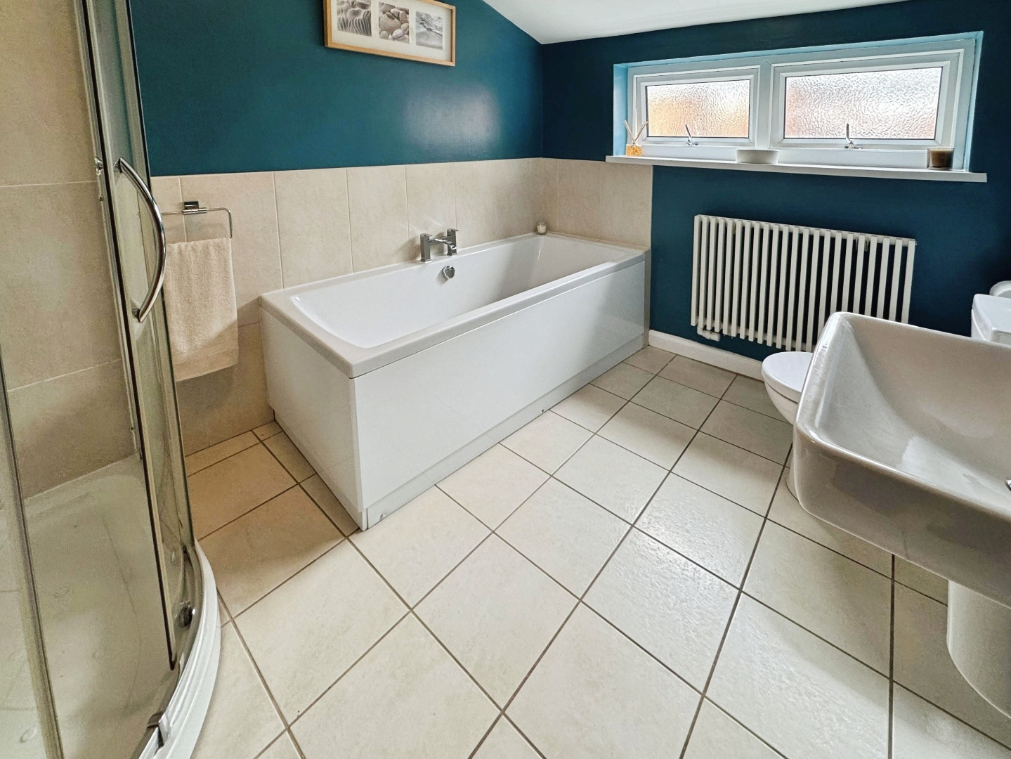 Large room fitted with modern bathroom suite including large panelled bath, wash hand basin, wc, separate walk in shower cubicle, tiled, with mains shower and spot lighting to ceiling, ceramic tiled floors and attractive tiled splashbacks, opaque UPVC double glazed window and contemporary central heating radiator, underfloor heating