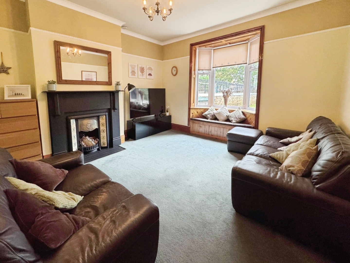 Feature open grate working fire with attractive tiled inserts and tiled hearth, dado rail, coving to ceiling, ceiling rose, television point, central heating radiator and feature UPVC double glazed bay window with wood panelled inset and seat overlooking the front garden