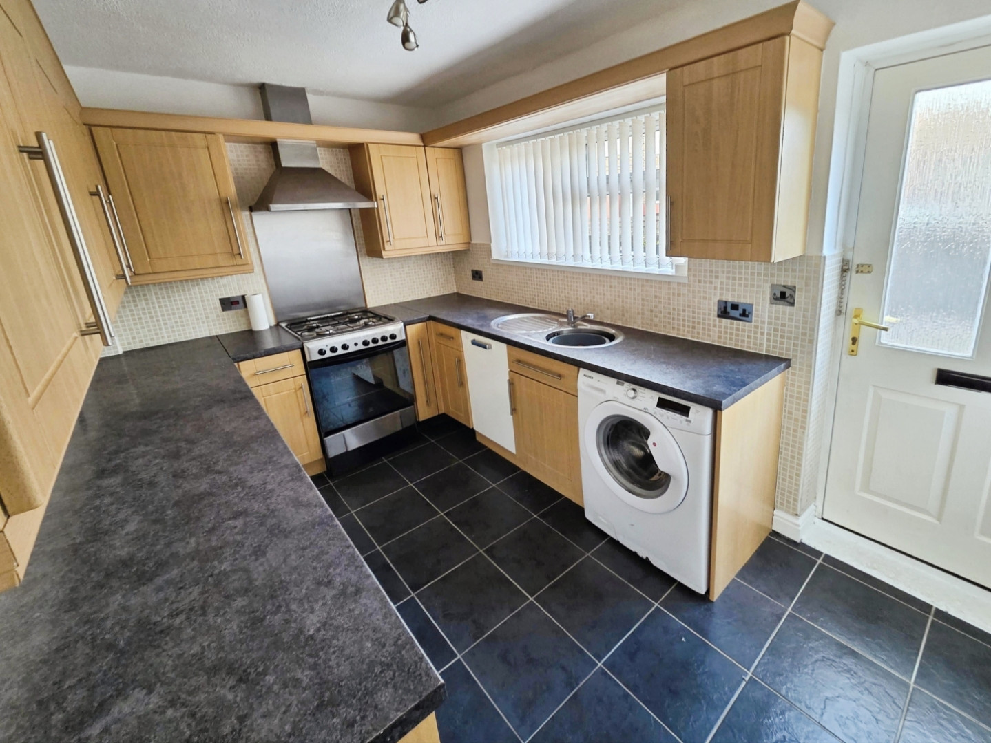 Fitted with a range of wall and base units with contrasting work surfaces over, circular sink unit and drainer, plumbing for washing machine, space for under counter fridge and freezer, central heating radiator and upvc double glazed window and door to rear.