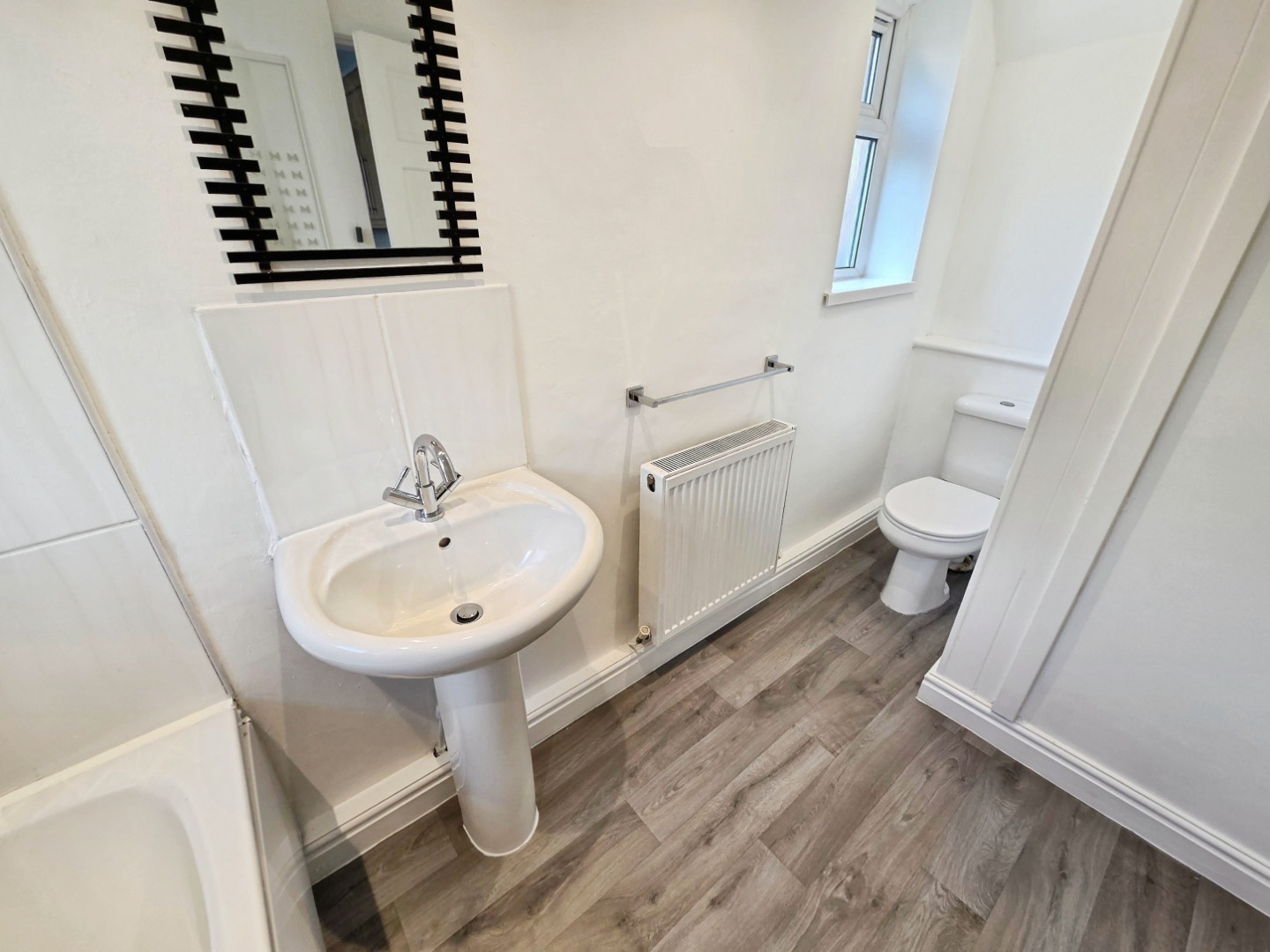 Fitted with a white suite comprising of panelled bath with mains shower and screen over, wc, wash hand basin and central heating radiator.